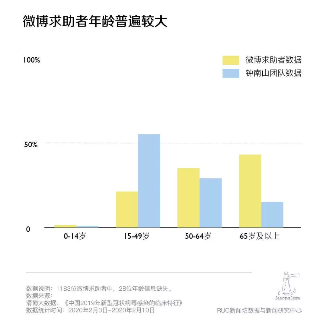 2月9日,钟南山院士领衔的“中国2019年新型冠状病毒感染的临床特征”研究在网上发表,其中公布了收治的1099例确诊患者的年龄分布,其中65岁及以上老人占比为15.1%。而微博求助者的年龄也普遍较大,65岁及以上的比例高达42.5%。