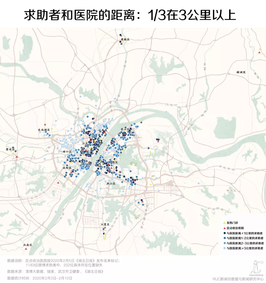 下图地图上圆点表示求助者的地理位置,黄色的三角表示武汉市公布的发热门诊,红色的三角表示在2月5日湖北日报发布的定点收治新冠病人的28个定点医院。可以看到,洪山区、江岸区和硚口、汉阳的部分区域有大量的求助人群距离这些发热门诊或定点医院较远。