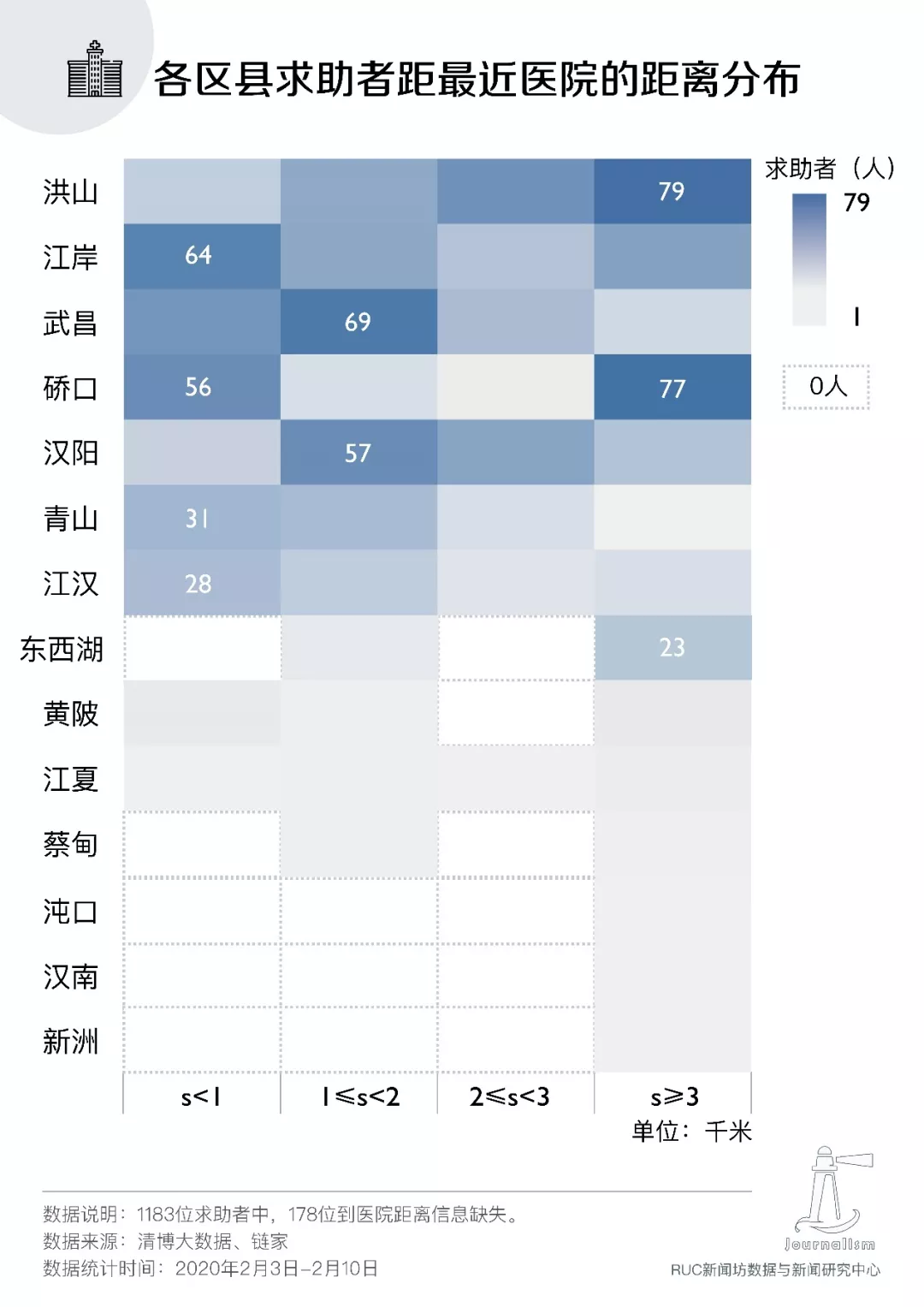 我们进一步对比了这些求助者的家庭住址与距离自己最近的医院之间的距离。下图中的方块颜色代表数量,颜色越深说明距离在这个范围内的求助者越多。可以看到武昌区、青山区和江汉区的求助者,大部分与距离自己最近的医院相离2公里以内,而洪山区和硚口区有大量的求助者,在3公里以内没有发热门诊和定点医院(以百度地图测算,成年人一小时步行距离为4公里。考虑到求助者年龄偏大,我们以3公里作为求助者步行1小时的距离)。