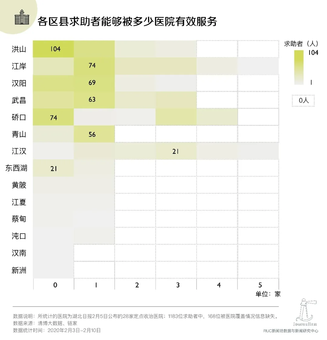 武汉的“封城”进一步增加了这些求助者就医的难度,财新曾经报道过步履蹒跚的老人相互搀扶走向医院的场景。无法及时得到诊断和救治使他们面临病情恶化的风险,也增加了交叉感染的可能。所在行政区定点收治医院较少、与医院之间距离较远、公共交通停摆等原因使这些求助者每日辗转于小区和医院之间,在等待确诊与收治的过程中艰难求生。