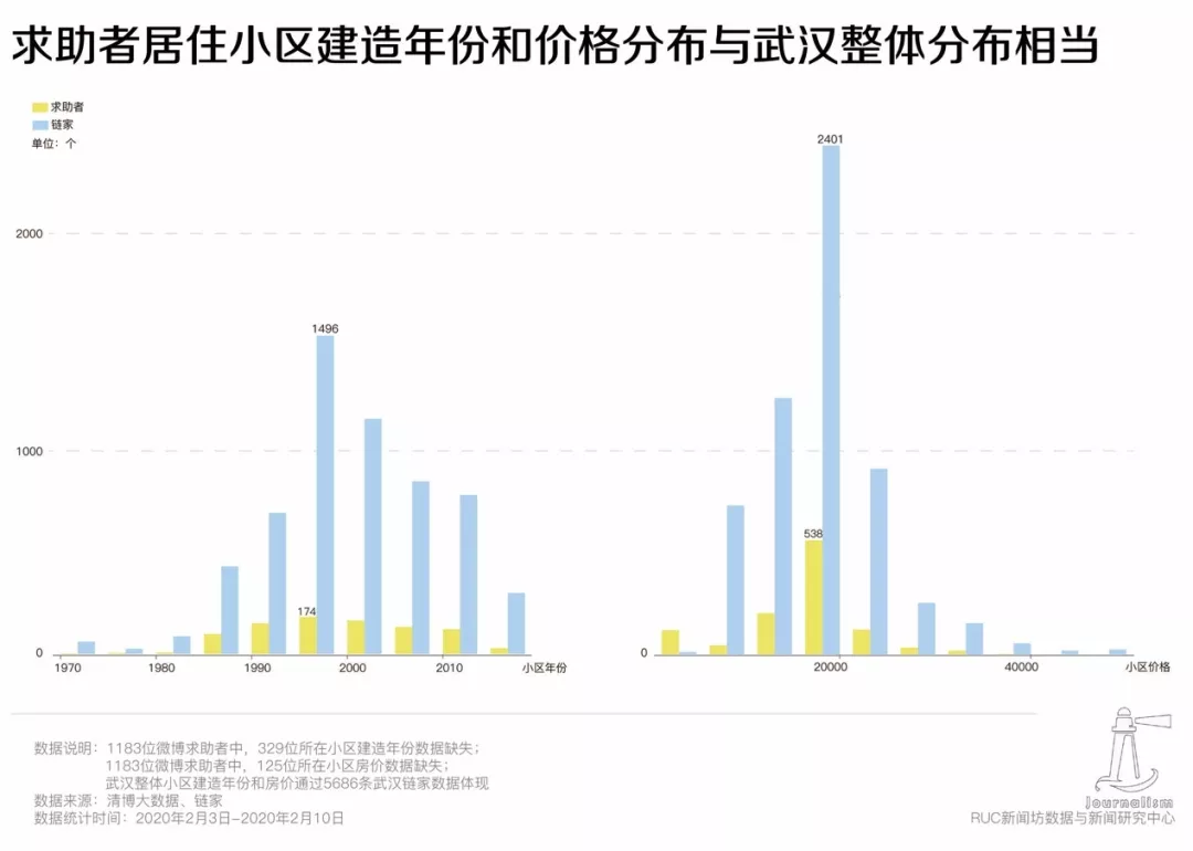 进一步分析这些求助者所在小区的房价和年份,并与武汉链家的数据进行对比可见,这些求助者所居住的房屋,无论是价格还是年份,都与武汉住宅的整体分布相当。也就是说,他们并不是传统意义上的“弱势群体”,他们可能就是你我。