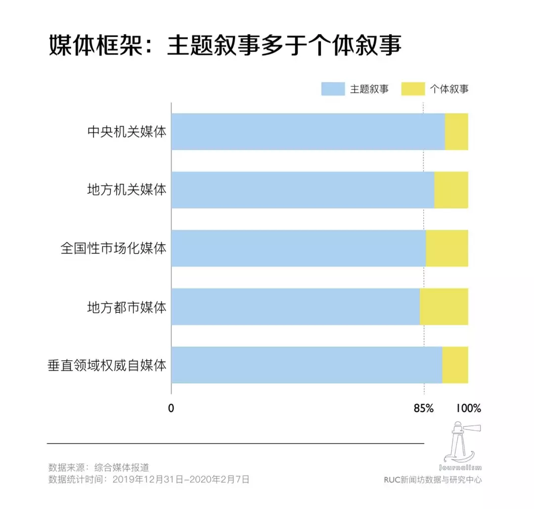 是我们也看到,在所有的报道中,采取个体报道框架的只占13%。更多的报道采取了主题框架,即聚焦于“抗击疫情”这一主题,患者是为了服务于这一主题而存在的,他们是被动接受救助的对象,是被社会关切的“幸运者”。