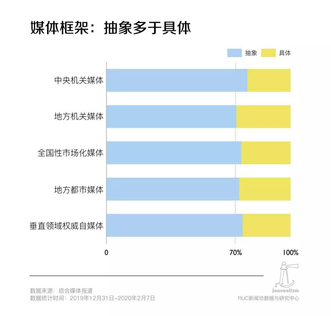 在这些报道中,有385篇报道具体框架,即更多地提供有关患者和治疗的具体细节,能够在帮助读者了解疫情的同时,一定程度减少恐慌。其中,以市场化媒体和地方都市媒体更为显著,如新京报1月2日发表的《武汉不明原因肺炎患者转入传染病医院,市场附近有居民感染》,记者走访多家收治新冠患者的医院,采访到了最早的一批感染患者,在情况尚不明朗时为读者提供了第一手的信息和细节;1月31日,南方都市报首次公布了深圳累计确诊的134名新型肺炎患者的病状和行踪,具体到了他们曾逗留过的82个小区,随后是广州和北京两地的信息公开。在这里,媒体借助自己的声量进一步扩大了公开信息的影响力,有利于公众知悉确诊病人的详细活动范围,核实自身是否与患者有交集,从而更精准地防护。