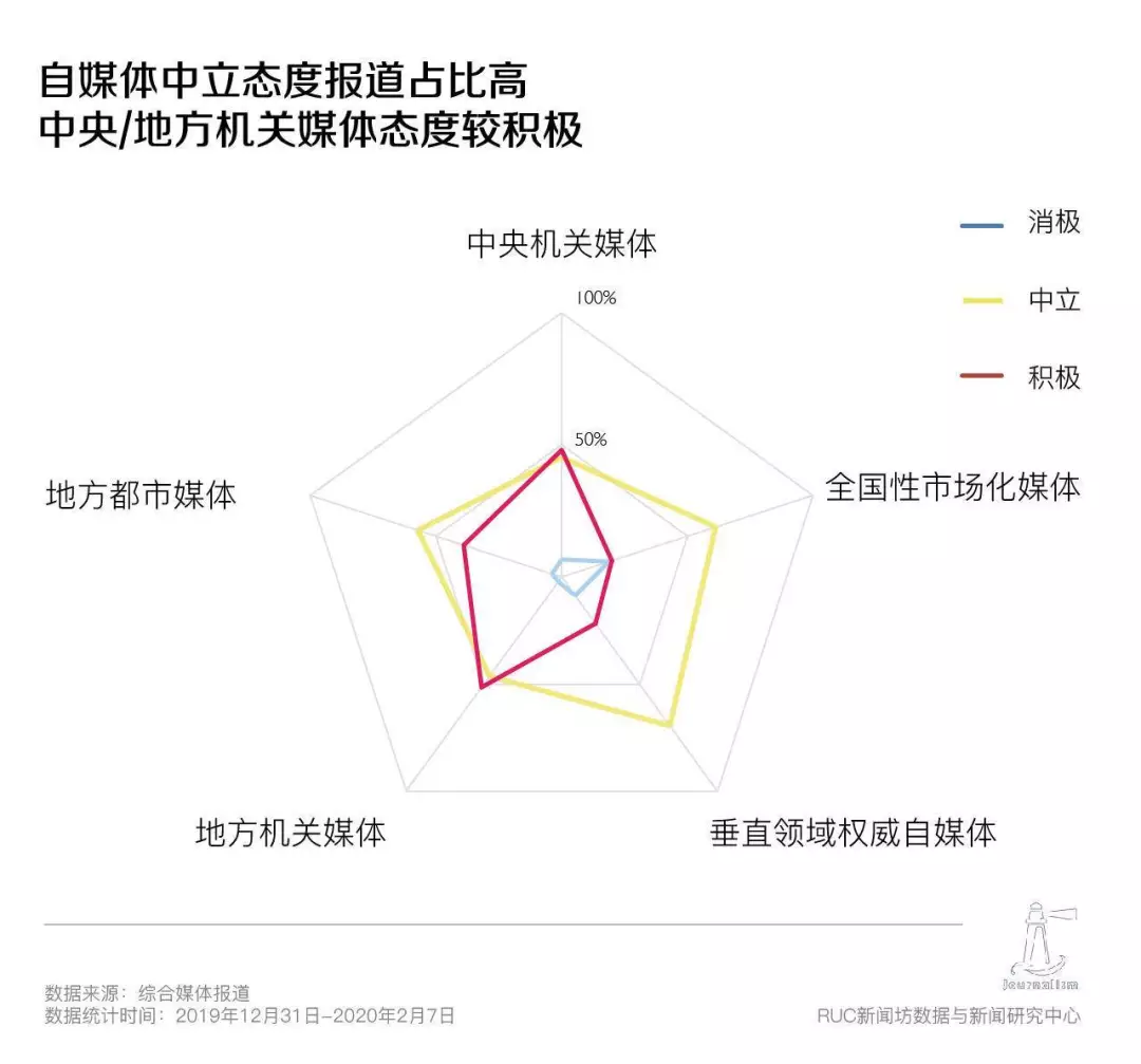 7%的报道采用了偏消极的态度,其中以市场化媒体和中央机关媒体最为突出。例如中国青年报的《中青报记者大年初一探访武汉市第五医院》,报道直击武汉市定点医院医疗资源紧缺、医患关系紧张的真实状况。澎湃新闻的《试剂盒短缺,武汉一家七口“疑似感染”:我能扛,孩子怎么办》则记录了一名武汉市民一家七口疑似感染、三岁孩子被医院拒收的恐慌与焦虑。健康传播领域有研究证明,对痛苦经历的讲述与传播可以使讲述者获得更多情感支持和心理帮助。直面较为消极残酷的事实,在让讲述者获得情感支撑的同时,更有利于我们在这场局势复杂的战争中有的放矢,让有类似经历的群体获得更有针对性的关怀、帮助。