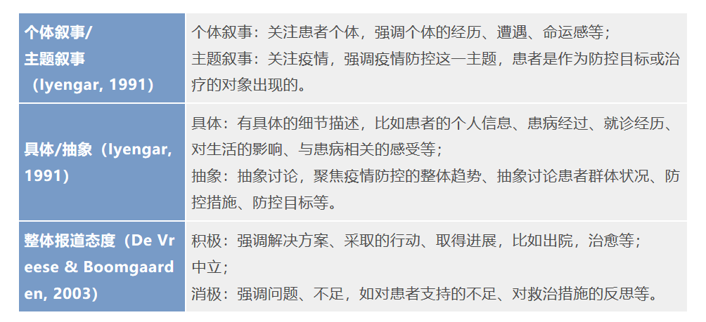 本研究参考现有相关领域文献,聚焦新冠患者报道的媒体框架。主要编码类别包括: