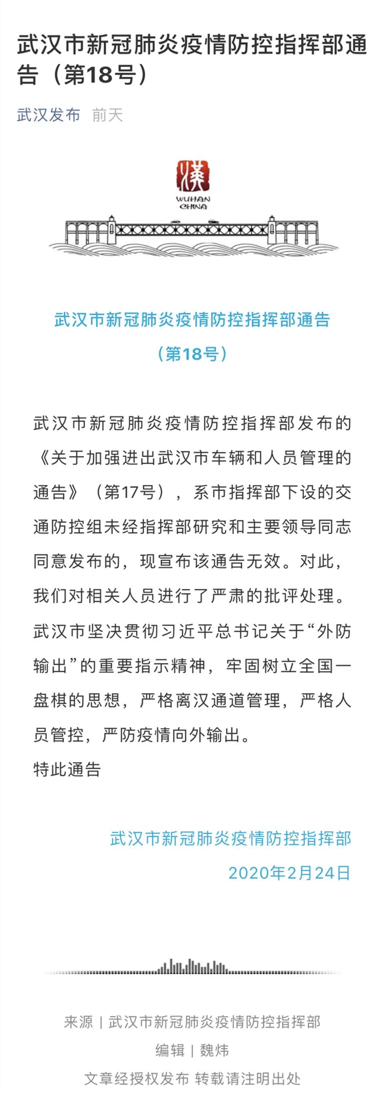 第18号文件内容显示,武汉市新冠肺炎疫情防控指挥部此前发布的《关于加强进出武汉市车辆和人员管理的通告》(第17号),系市指挥部下设的交通防控组未经指挥部研究和主要领导同志同意发布的,现宣布该通告无效。