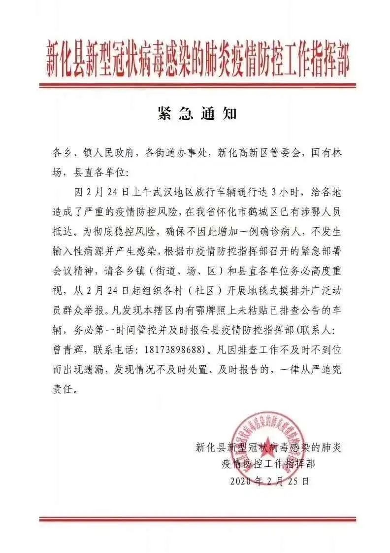 在一份落款为“新化县(注:湖南省娄底市属县)新型冠状病毒感染的肺炎疫情防控指挥部”的紧急通知上,该县称因2月24日上午武汉地区放行车辆通行达3小时,相邻地区怀化市鹤城区已有涉鄂人员抵达,为彻底稳控风险,将在全县开展地毯式摸排清查。