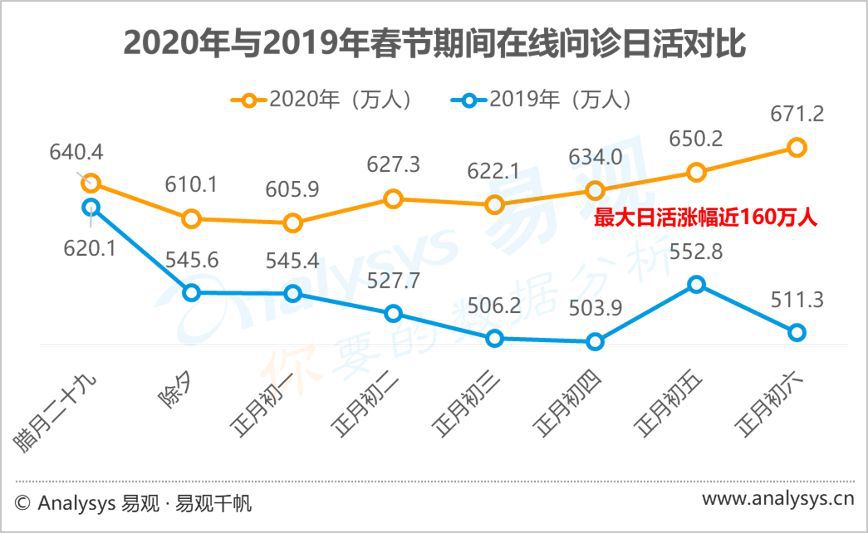 易观研究院数据显示,2020年春节期间,在线问诊领域独立APP日活最高峰达到了671.2万人,最大涨幅接近160万人,涨幅31.28%。易观分析师陈乔姗认为,疫情促使更多用户自愿或半自愿地开始了解和接触在线医疗。“义诊活动不仅大幅提高了互联网医疗用户的整体规模和渗透率,同时也成功‘出圈’,触达到健康人群,为互联网医疗领域收获了新的流量。”