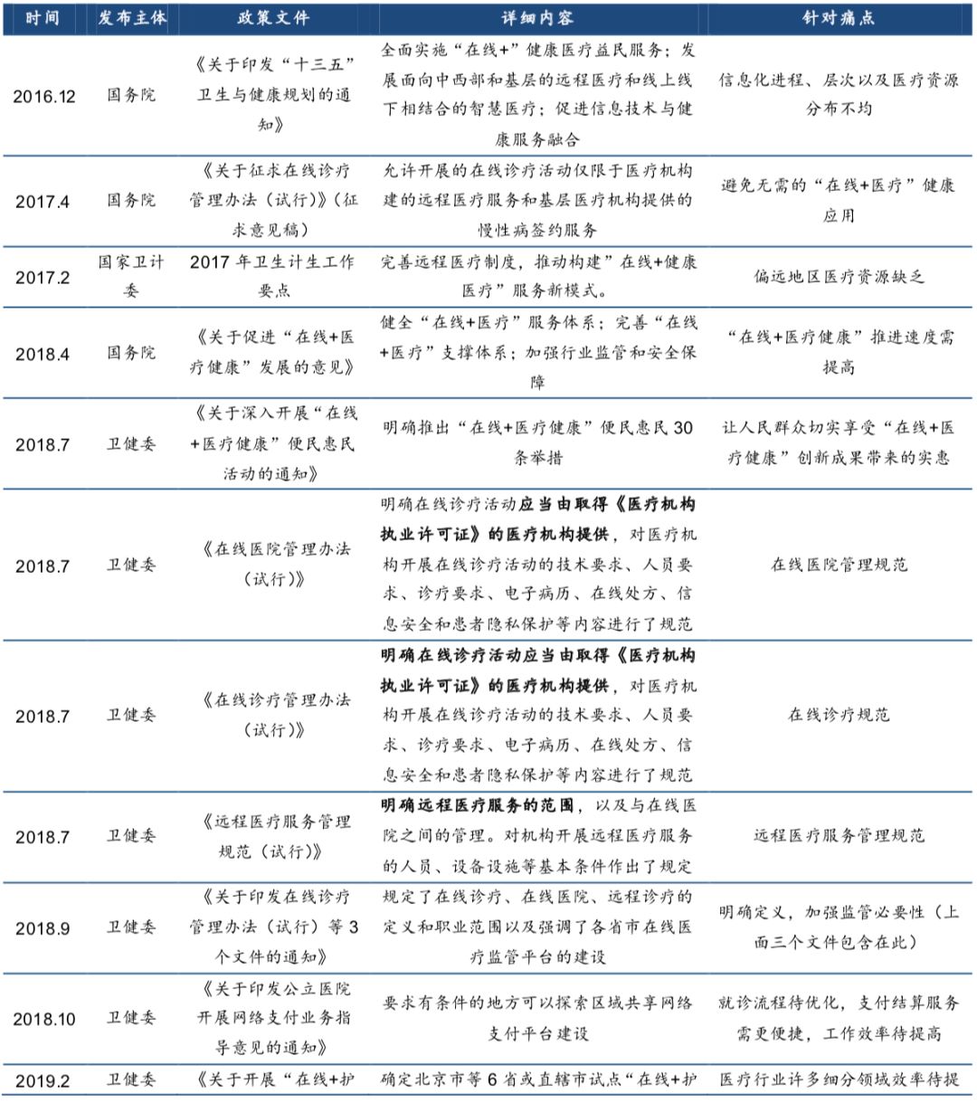 据东兴证券不完全统计,从2016年至2019年,国务院和卫生部门发布了十几份关于“加强在线医疗建设”的政策文件。政策主要分为两类:一类着重于“规划”:针对现阶段医疗行业出现的医疗资源不均衡、医疗流程效率不高等问题,提出用在线医疗来提高医疗资源配置效率;另一类着重于“试行”:从放权、规范和监督三个层面支持在线医疗建设。