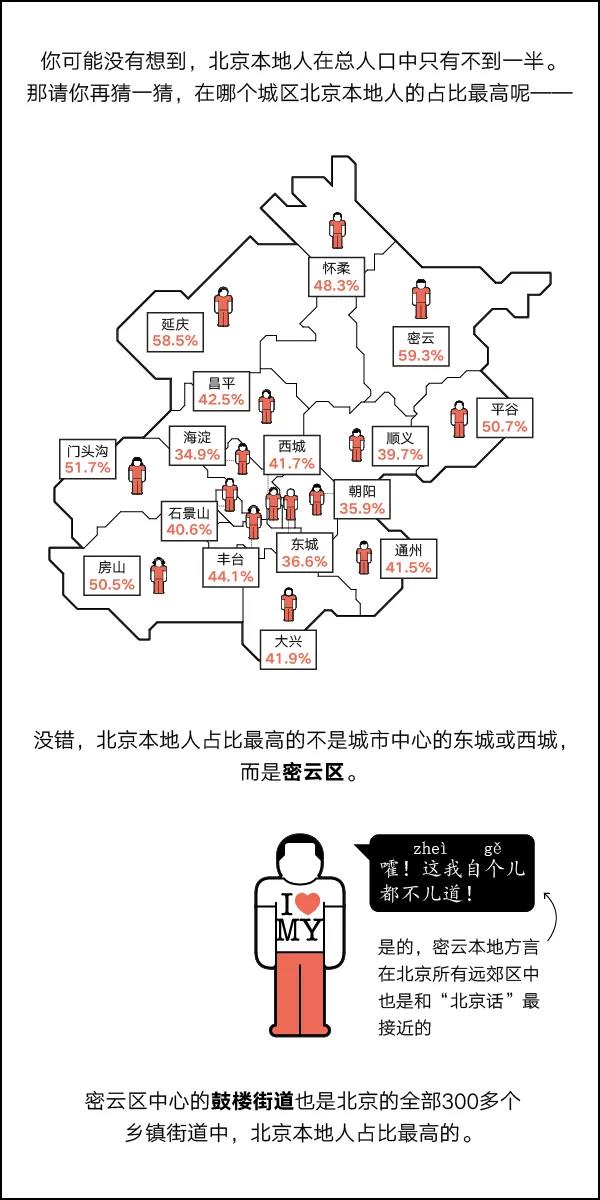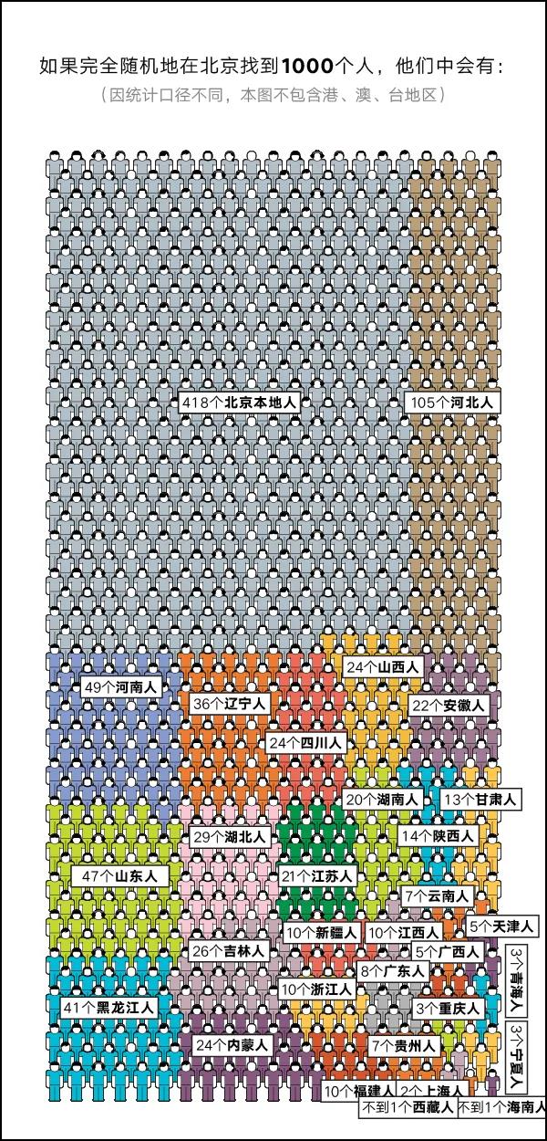 如你所见,在当今的北京,只有不到一半的人是严格意义上的“本地人”,而另外一多半则来自五湖四海。其实这并不令人意外,毕竟北京是一座在持续发展的,具有强大吸引力的超级大城市——过去是这样,现在是这样,未来可能也还会是这样,“北京人”、“外地人”的概念将越来越模糊,而北京也会成为越来越多人的第二故乡。
