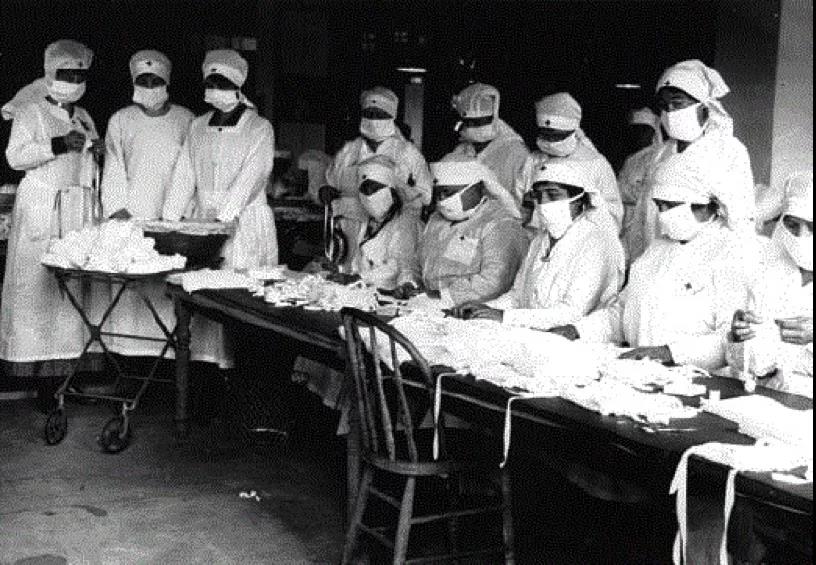 翻看美国人在1918年流感大流行期间的照片时,你会发现一个最突出的特征:口罩。白色纱布裁制而成的口罩几乎覆盖了每一张脸。