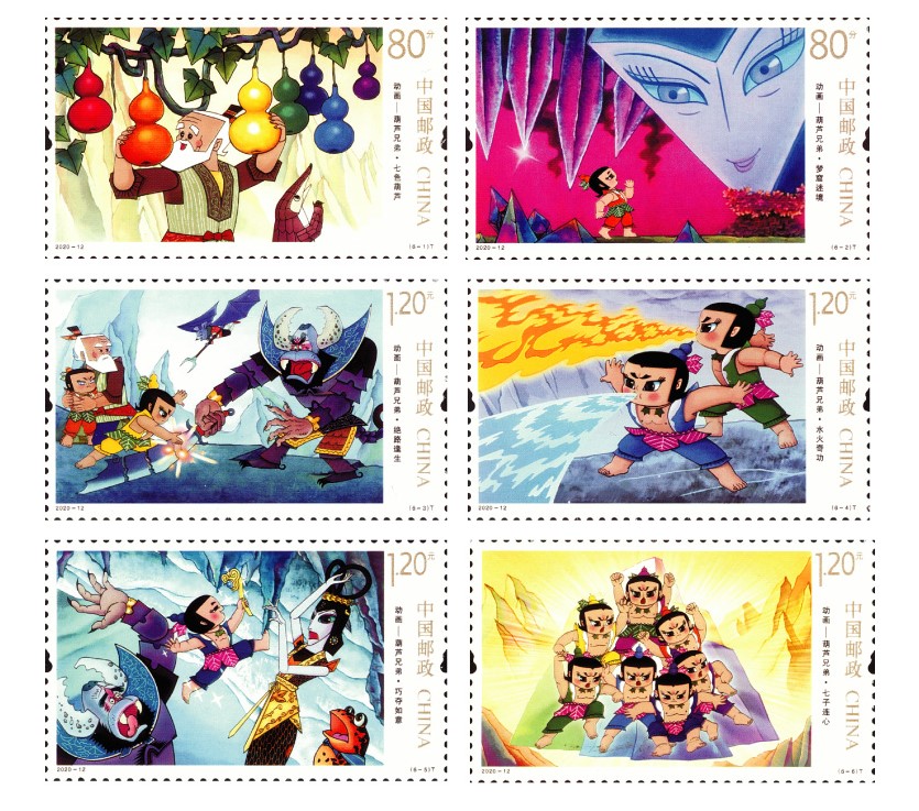 《葫芦兄弟》获得成功的重要因素之一,是紧张惊险而又妙趣横生的故事情节。中国邮政此次邮票设计采用的6组图案,每一枚都能再现经典场景,引发观众对剧情的追忆。而在密集型、激烈化的故事结构外,葫芦兄弟的美术造型也令人过目不忘。