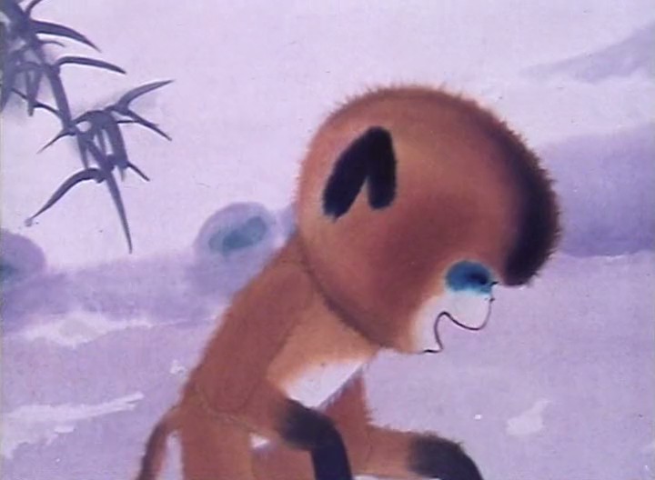 1982年,胡进庆在《淘气的金丝猴》中,使用了“拉毛”工艺。彩墨背景配上绒毛柔软蓬松的动物形象,让一幅幅国画跃然于银幕之上。“拉毛”工艺在第二年的《鹬蚌相争》中运用得更为纯熟。