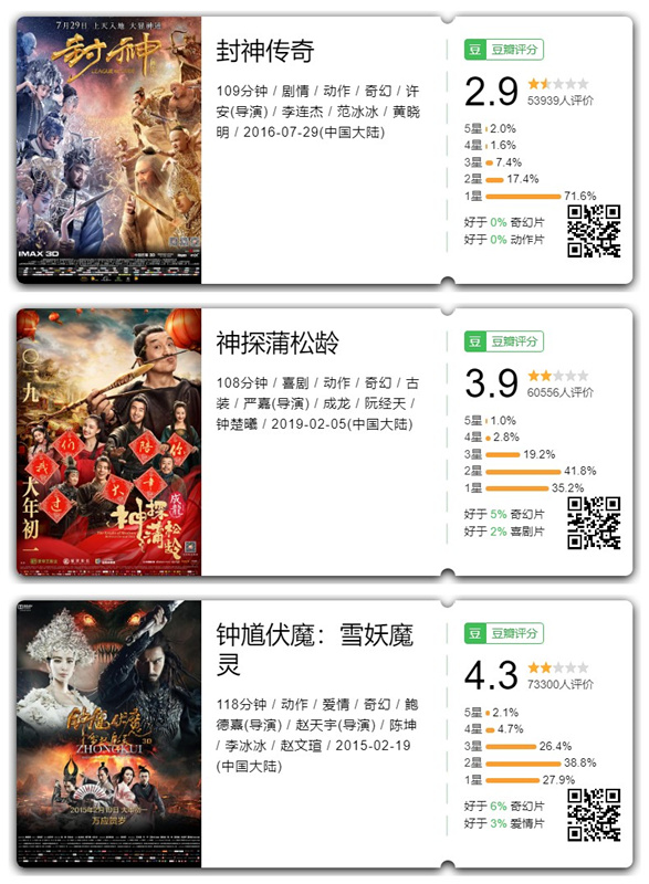 但是,纵览近些年的魔幻题材古装电影,如《封神传奇》《神探蒲松龄》等,靠吃经典文学的老本,剧情充斥雷人情节,口碑崩塌。观众的“求放过”,是对当前国产电影创作能力的不信任。