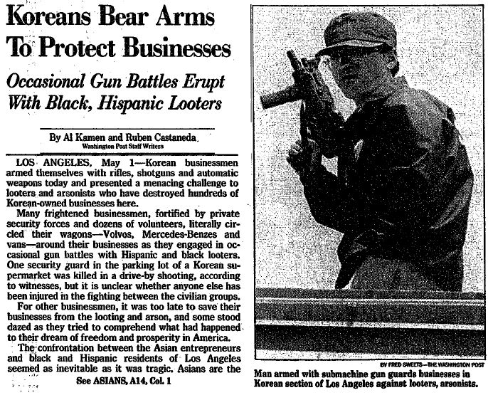 那时,韩裔躲在屋顶和车后面射击的照片在媒体上疯传,《华盛顿时报》评论,韩国人为保护商店抵抗暴徒。在美国各大电视台上,有两名韩裔用手枪向暴徒多次射击的画面被反复播出,该场面引发大量争议。《纽约时报》认为——“这似乎是一场种族战争。”