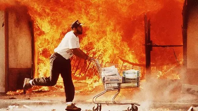 一个小火苗就能点燃一个炸药桶。当晚,在洛杉矶南部贫民区便开始了暴乱,黑人和拉丁裔移民,纷纷走上街头开始暴动,该地区的警察无奈撤退。