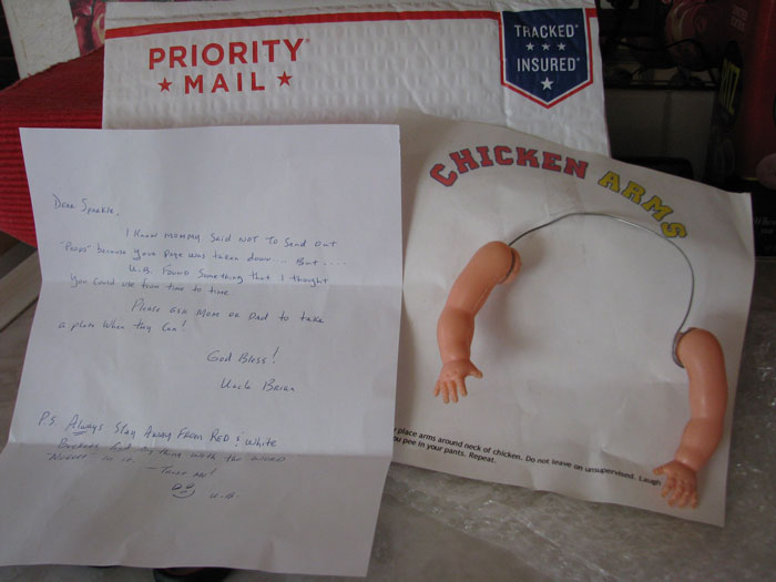 礼物是它在脸书上的粉丝“布莱恩叔叔(Uncle Brian)”寄来的。他煞有介事地给这对从洋娃娃身上扯下来的手臂做了个包装,硬纸壳上打着“小鸡手臂”的标志,上面标注了使用方法:“放在鸡脖子上,请勿在无监护的情况下使用”。他还写了一封信给火花,“记得让爸爸妈妈拍张照片给你!”
