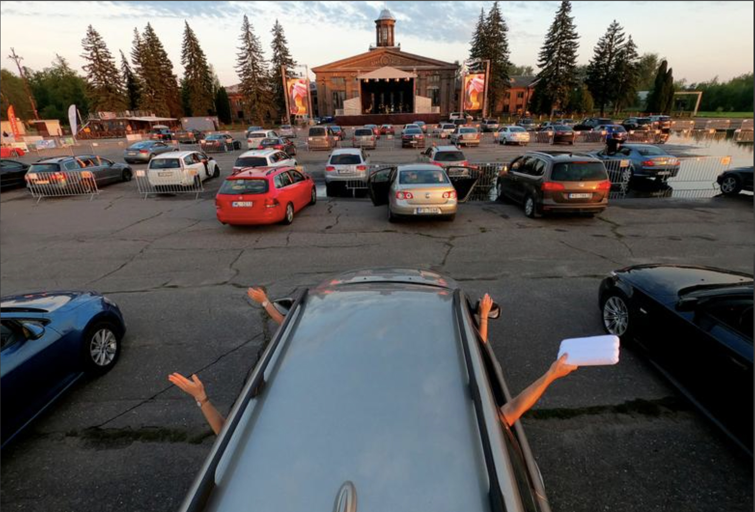 6月11日,拉脱维亚首都里加,人们坐在汽车里欣赏音乐会。图源:Ints Kalnins