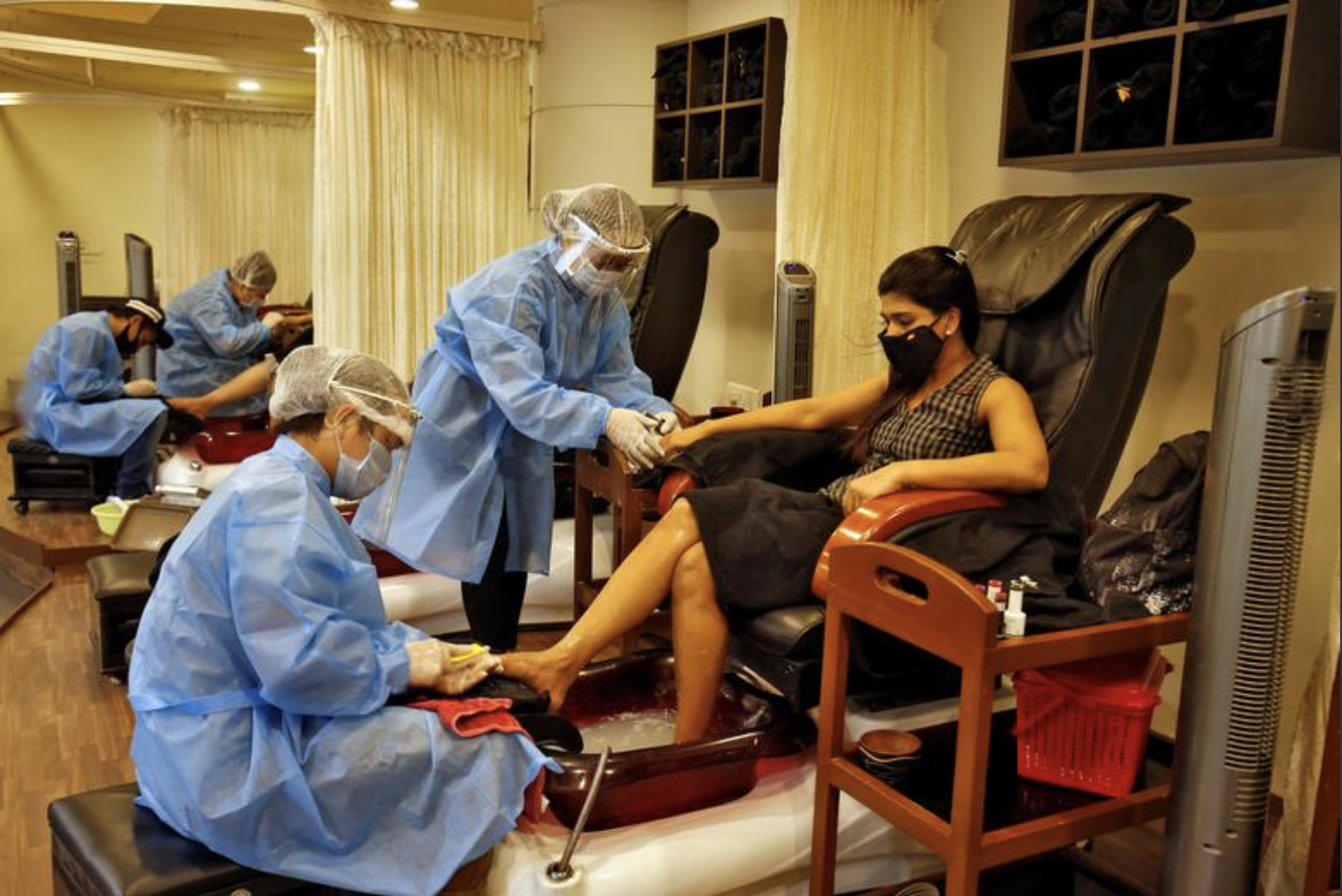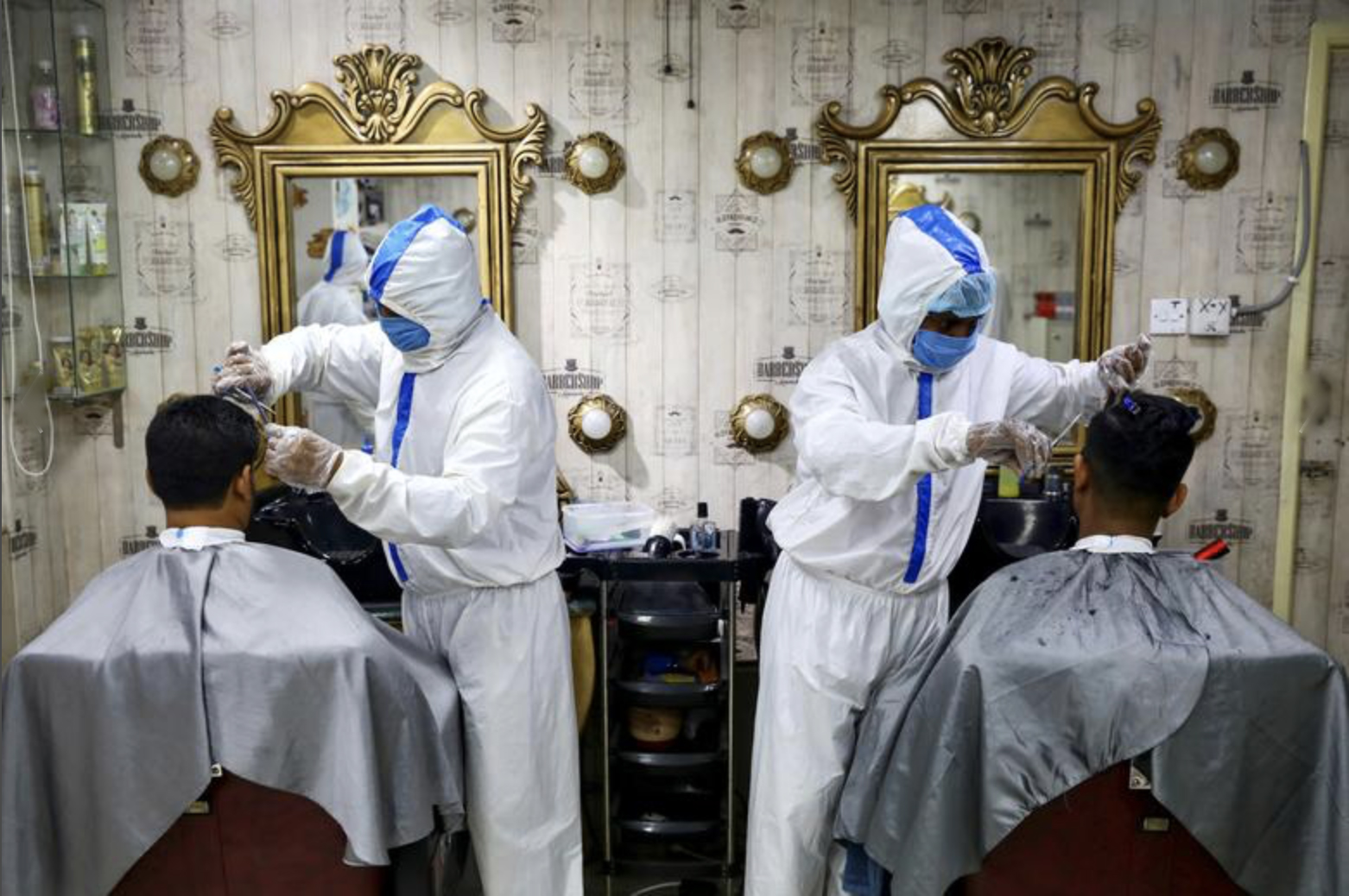 6月8日,印度艾哈迈达巴德,在当局允许购物中心重新开业后,穿着防护装备的美容师在接待顾客。图源: Amit Dave
