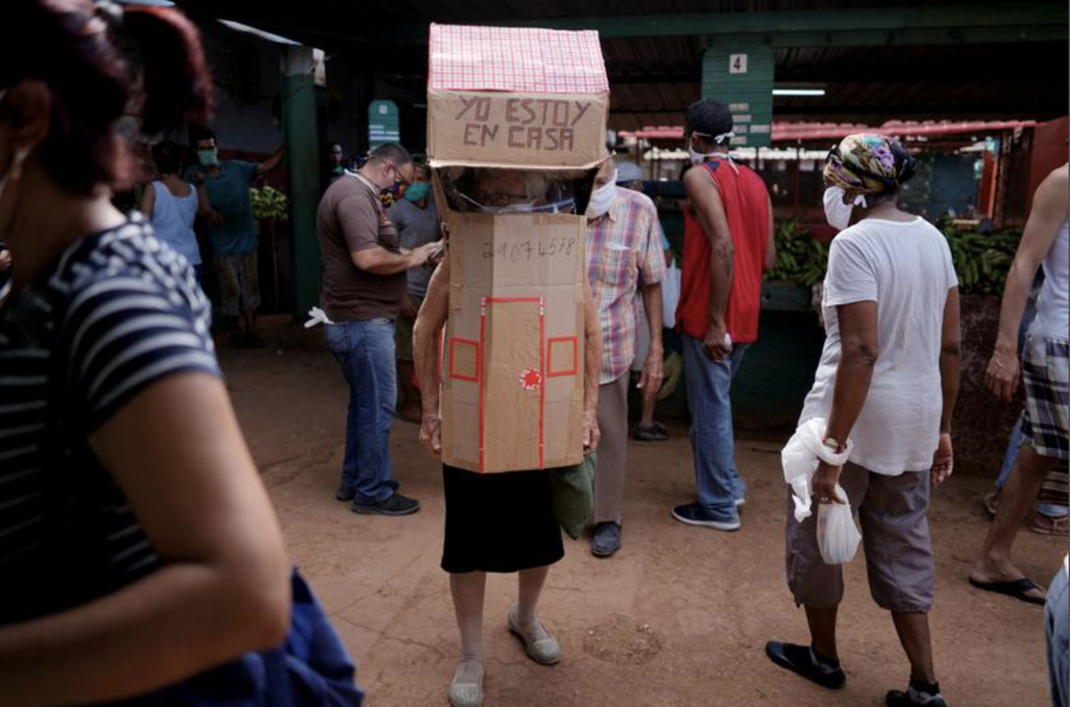 6月11日,古巴哈瓦那,一位82岁的退休护士穿着纸板做成的衣服进入市场,以保护自己免受冠状病毒感染。因为在当地,商店里没有个人防护设备。“我在家,你呢?”她的盒子上写着这样一条信息,这是对防疫口号“呆在家里”的诙谐回应。图源:Alexandre Meneghini