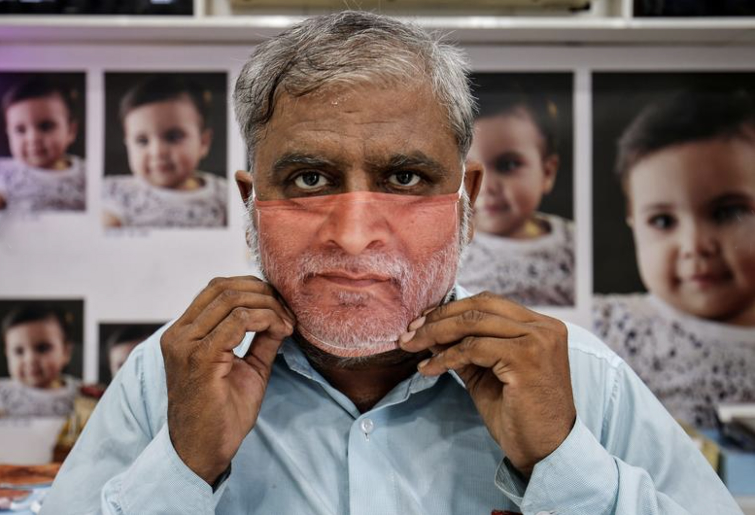 5月27日,印度,一名男子在一家照相馆试戴印有自己头像的口罩。图源:Amit Dave