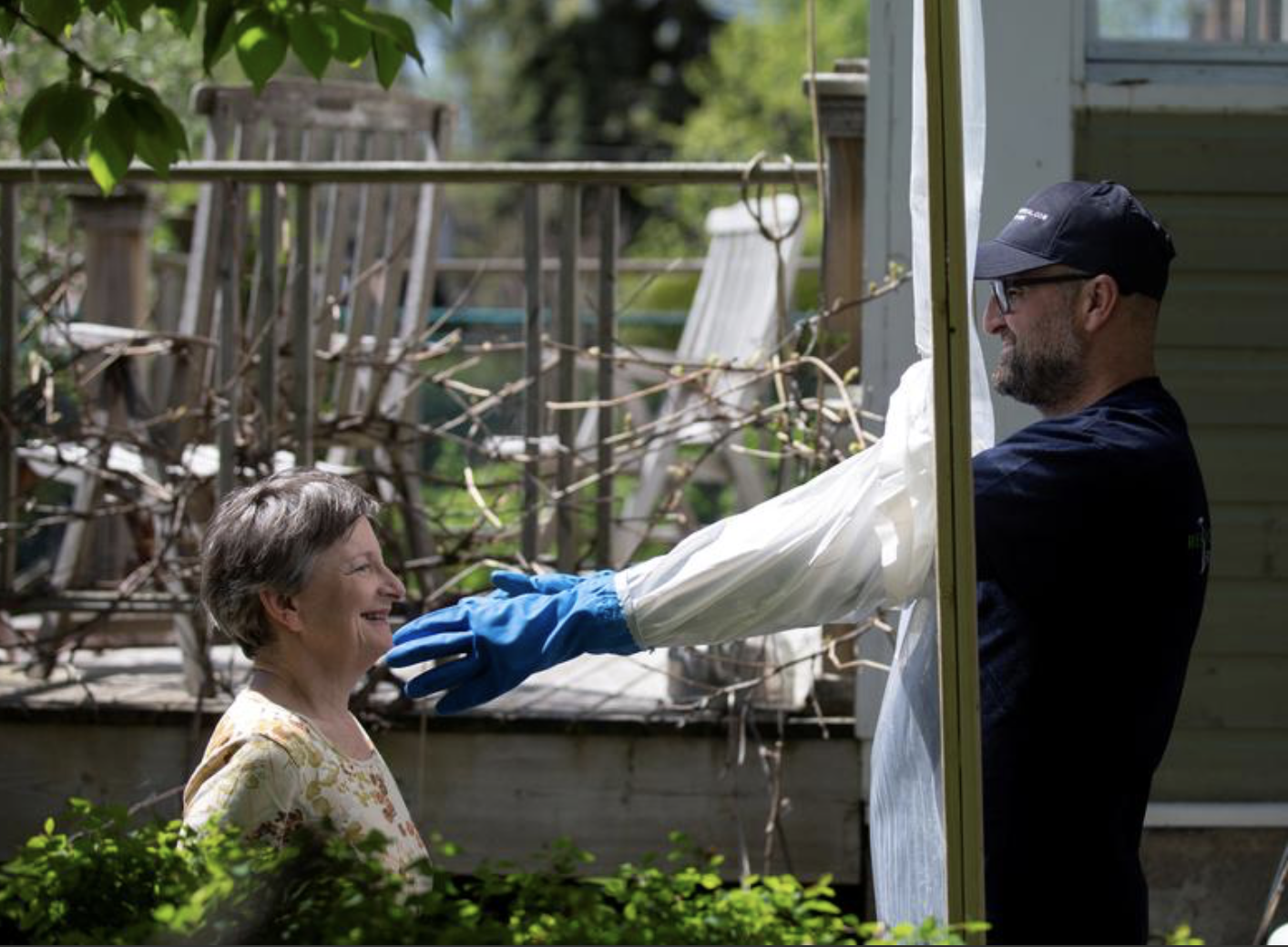 5月21日,加拿大魁北克省的蒙特利尔,亚历克斯·蒙塔加诺向邻居莎伦·皮尔克斯-安德森展示了他的“拥抱站”,这是他为了拥抱家庭成员同时预防病毒传染而建造的。图源:Christinne Muschi
