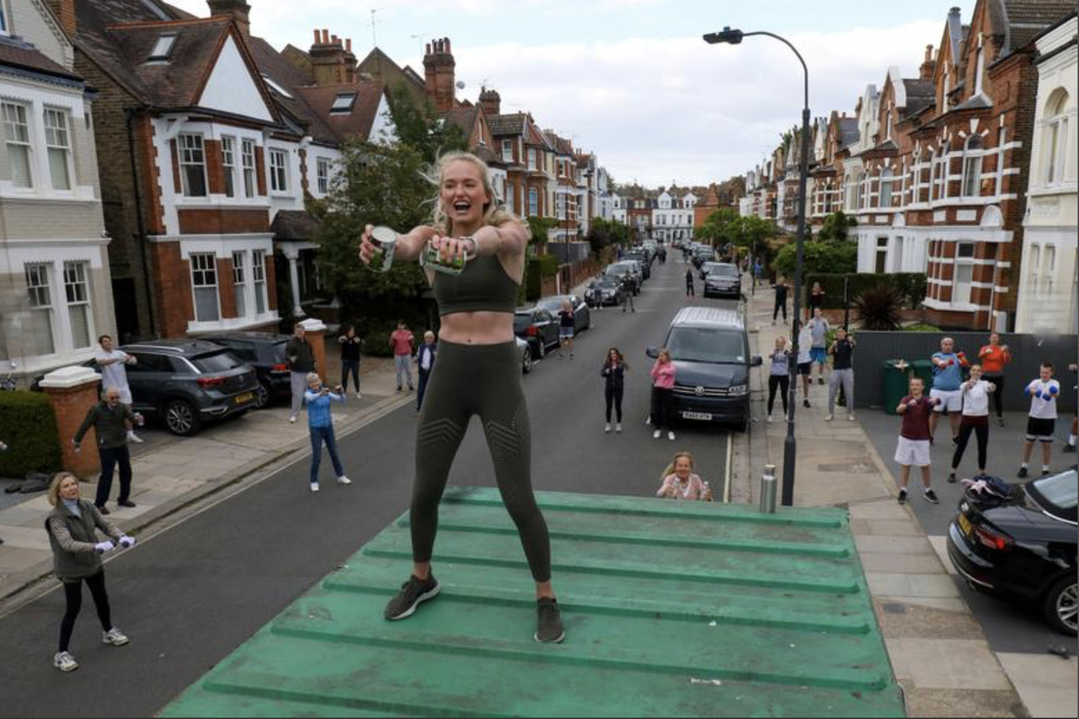 5月11日,在伦敦西部的富勒姆,一位私人教练带领纳皮尔大道的居民们上健身课。图源:Kevin Coombs
