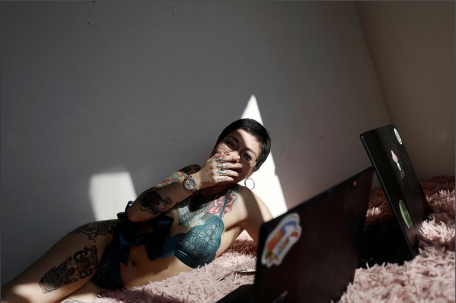 4月7日,智利康塞普西翁,24岁的性工作者可米娜·霍玛扎巴尔会见一位线上顾客。霍玛扎巴尔所在的夜总会因疫情爆发而关闭后,她现在在网上提供性服务。由于无法支付账单,霍玛扎巴尔便从她的高层公寓卧室打视频电话,并要求她的常客们在网上与她见面。图源:Juan Gonzalez