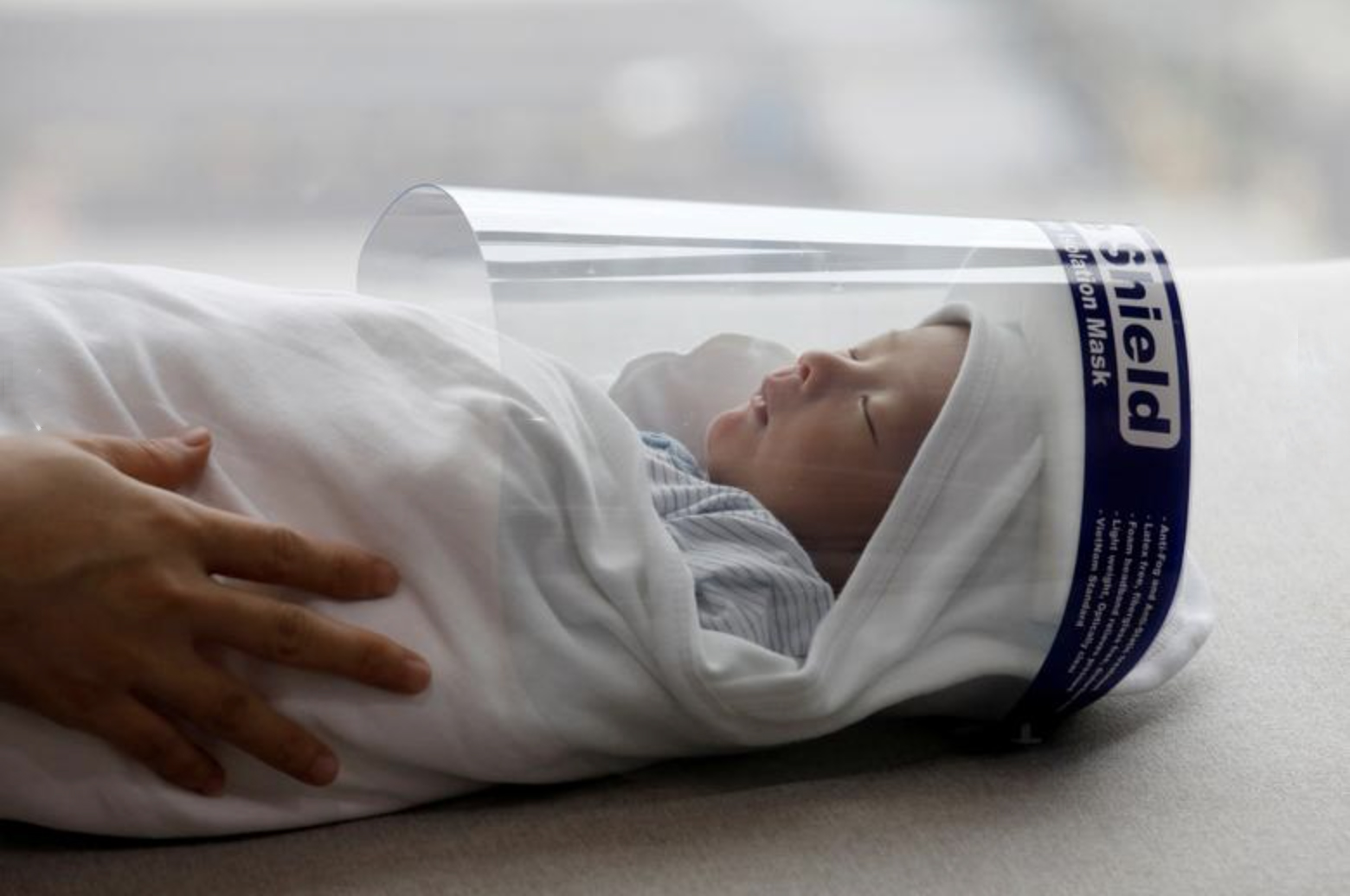 4月13日,越南河内,戴着防护面罩的新生儿福安接种疫苗前的照片。他于4月1日出生在河内医院,当时越南开始严格限制人口流动。图源:Kham