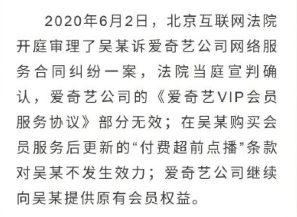 北京互联网法院对会员诉爱奇艺《庆余年》超前点播案宣判结果
