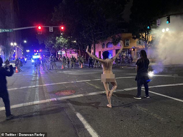 为了驱散人群,联邦部队开始向愤怒的抗议者发射胡椒球,这时候,一位裸体女子从催泪瓦斯的烟雾中出现,像一个幽灵。