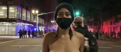 波特兰市“反种族歧视、反暴力执法”的示威活动已经没有间断地进行58天了。7月18日,周六的晚上,“顽抗”的群体中出现了一个特殊的身影,一名对峙联邦部队的裸身女子。