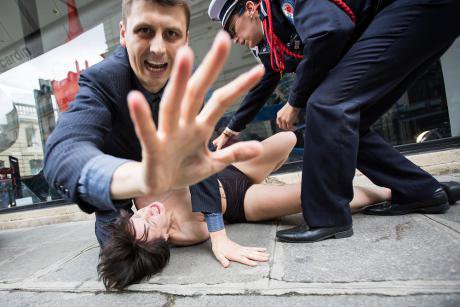“我们脱掉上衣,在胸前贴上标语,只是大喊口号,其他什么也不做。但我们还是被按在地上,被勒脖子,被绑架,被逮捕。这是不平等的。这是父权制机构对敢于提出不同意见的女性施加的暴力”。舍甫琴科说。