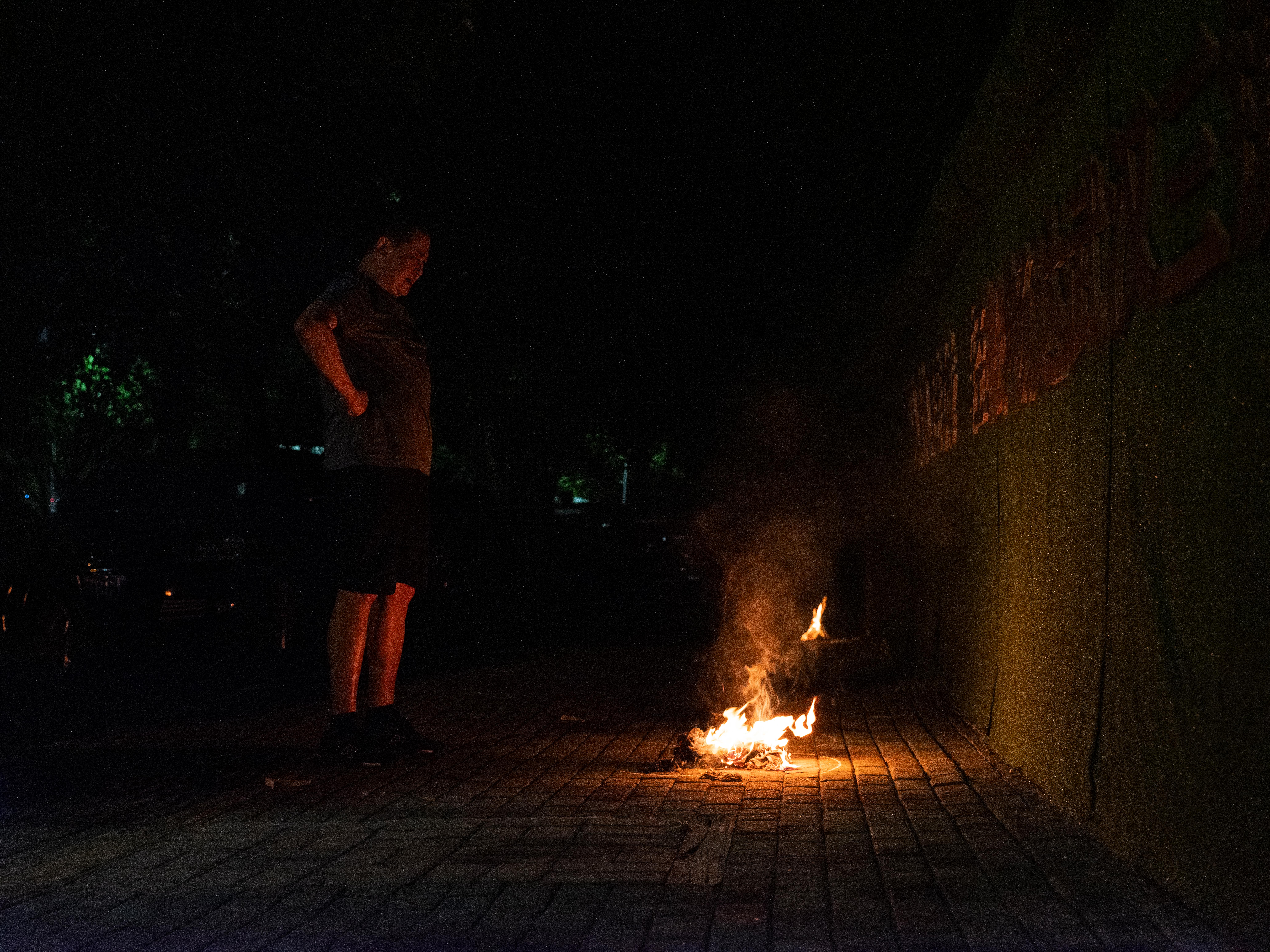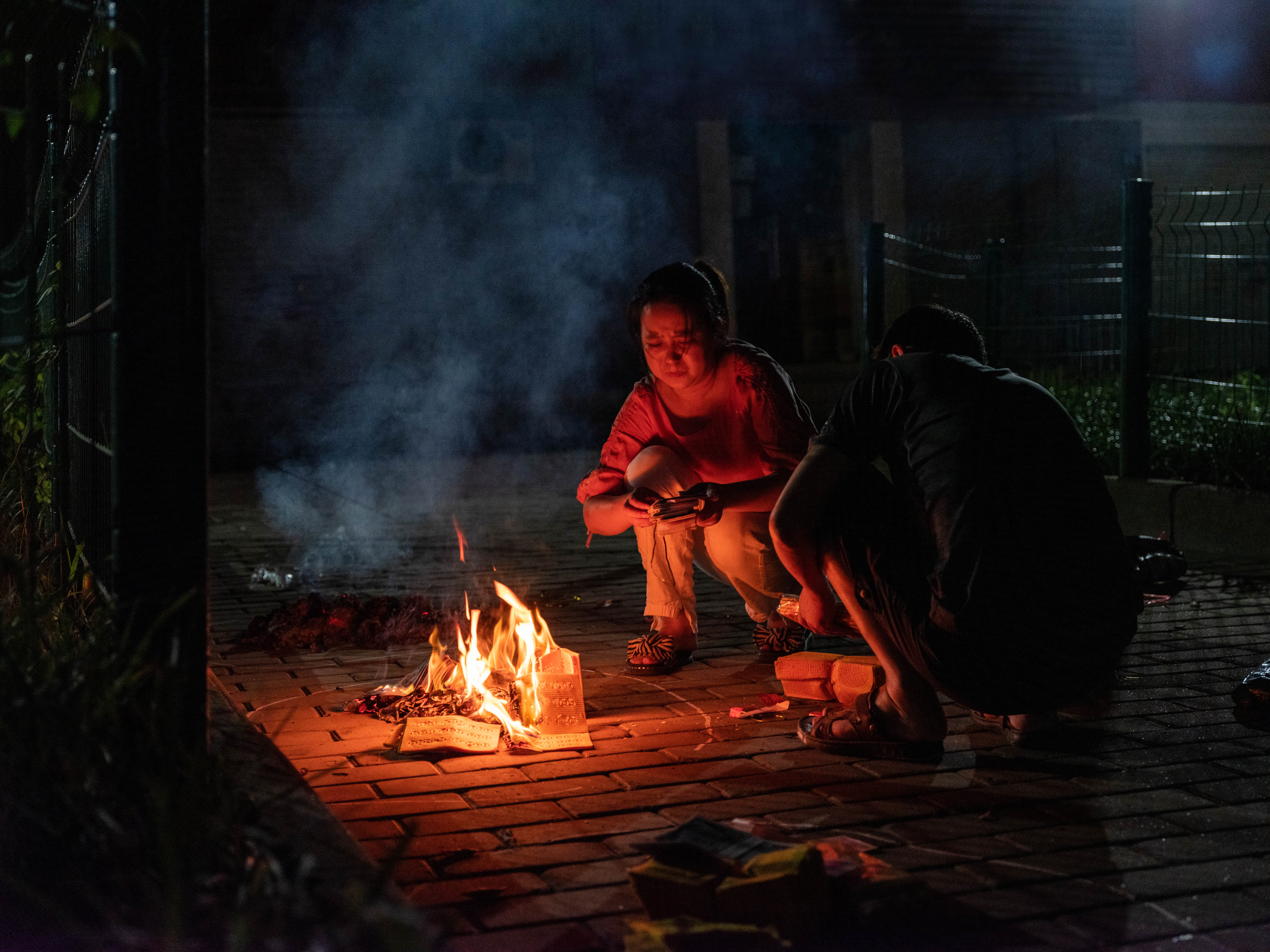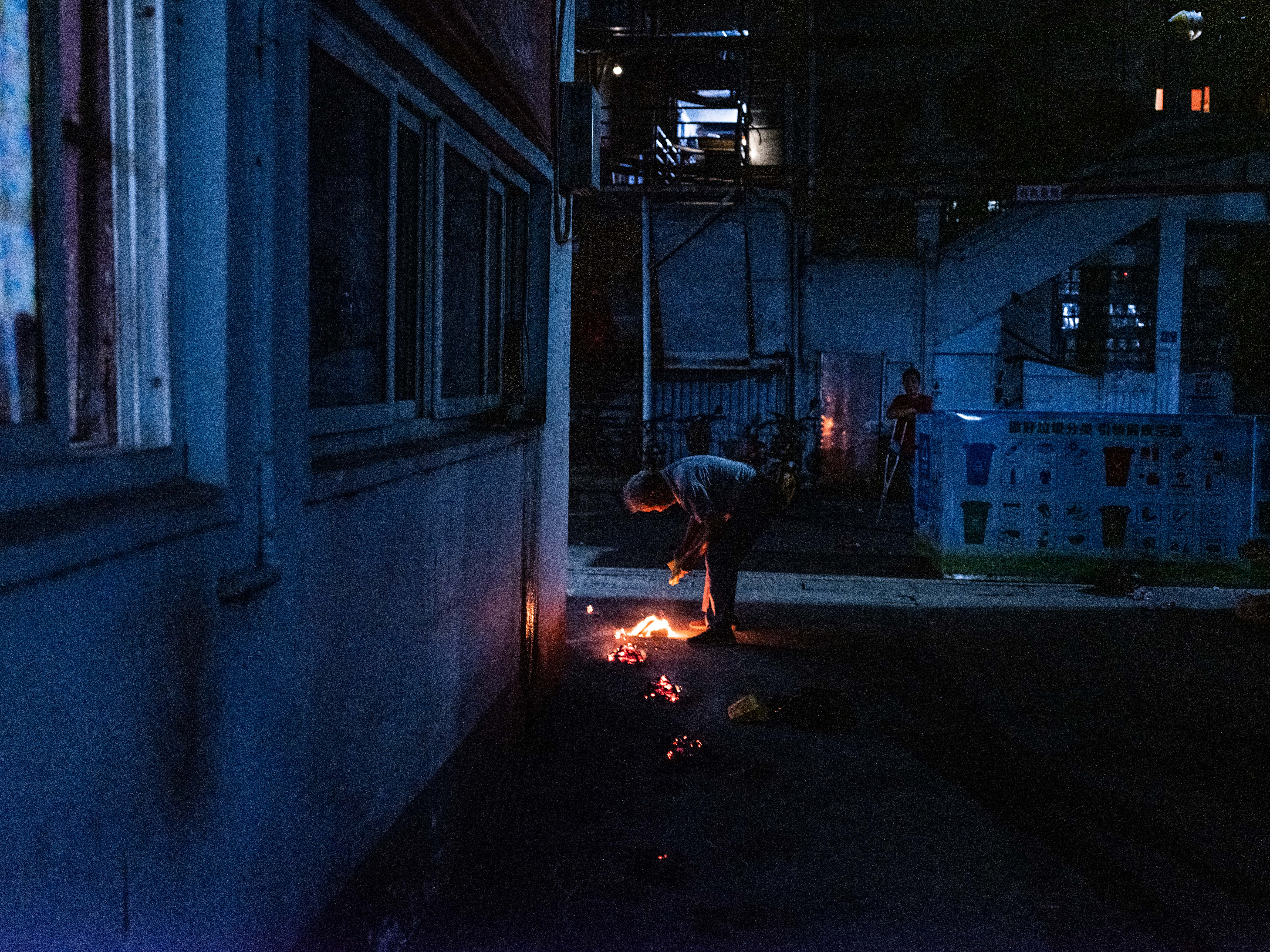 田老先生就住在吉庆社区,今年94岁,已经耳聋。农历七月十四晚七点半,他在地面上画了七个圆圈,每个圆圈都代表一个家属,“一个老伴的、一个父亲的、一个母亲的,其他的圈是烧给今年被新冠带走的和无家可归的野鬼,都不容易,给他们也烧一点。这个圈圈要留个缺口,他们才好拿钱。”年过六旬的儿子站在不远处陪着,因单腿残障,今年和老父亲度过了一个非常不易的春节,“我父亲有隐疾,那会儿也很不容易搞进医院做治疗,这个年岁在疫情期间活下来也不易,但他觉得自己占用了医疗资源。”