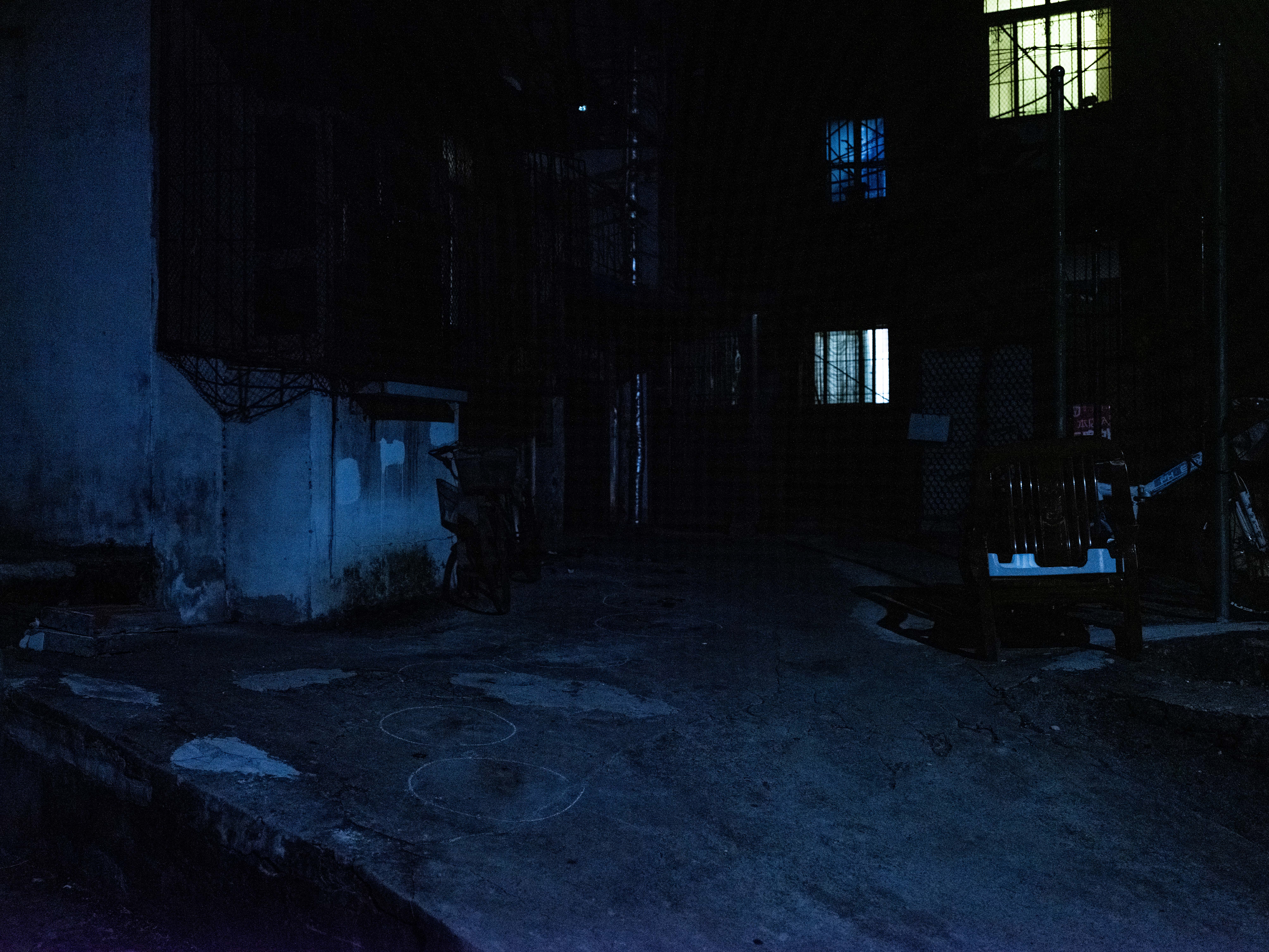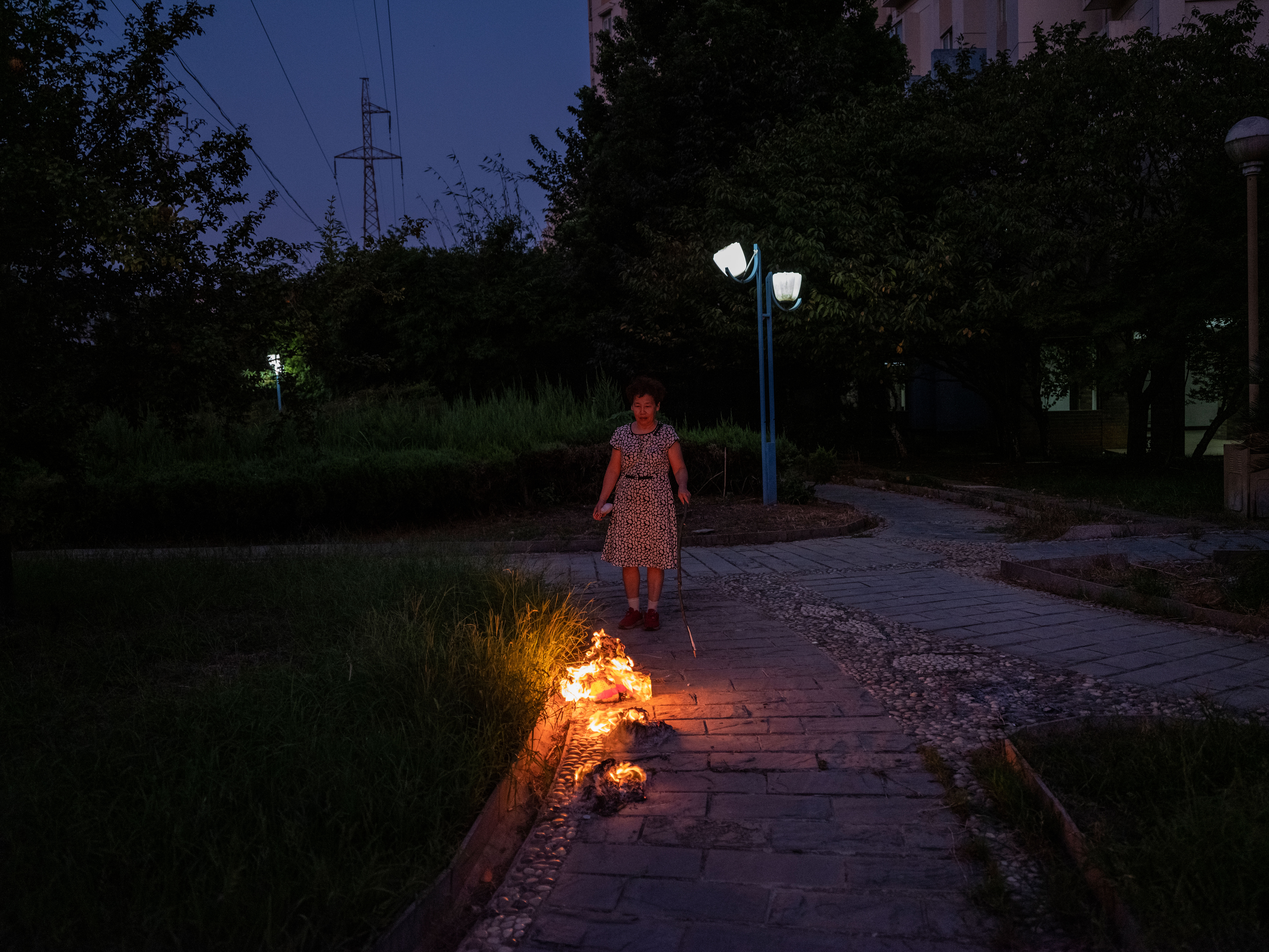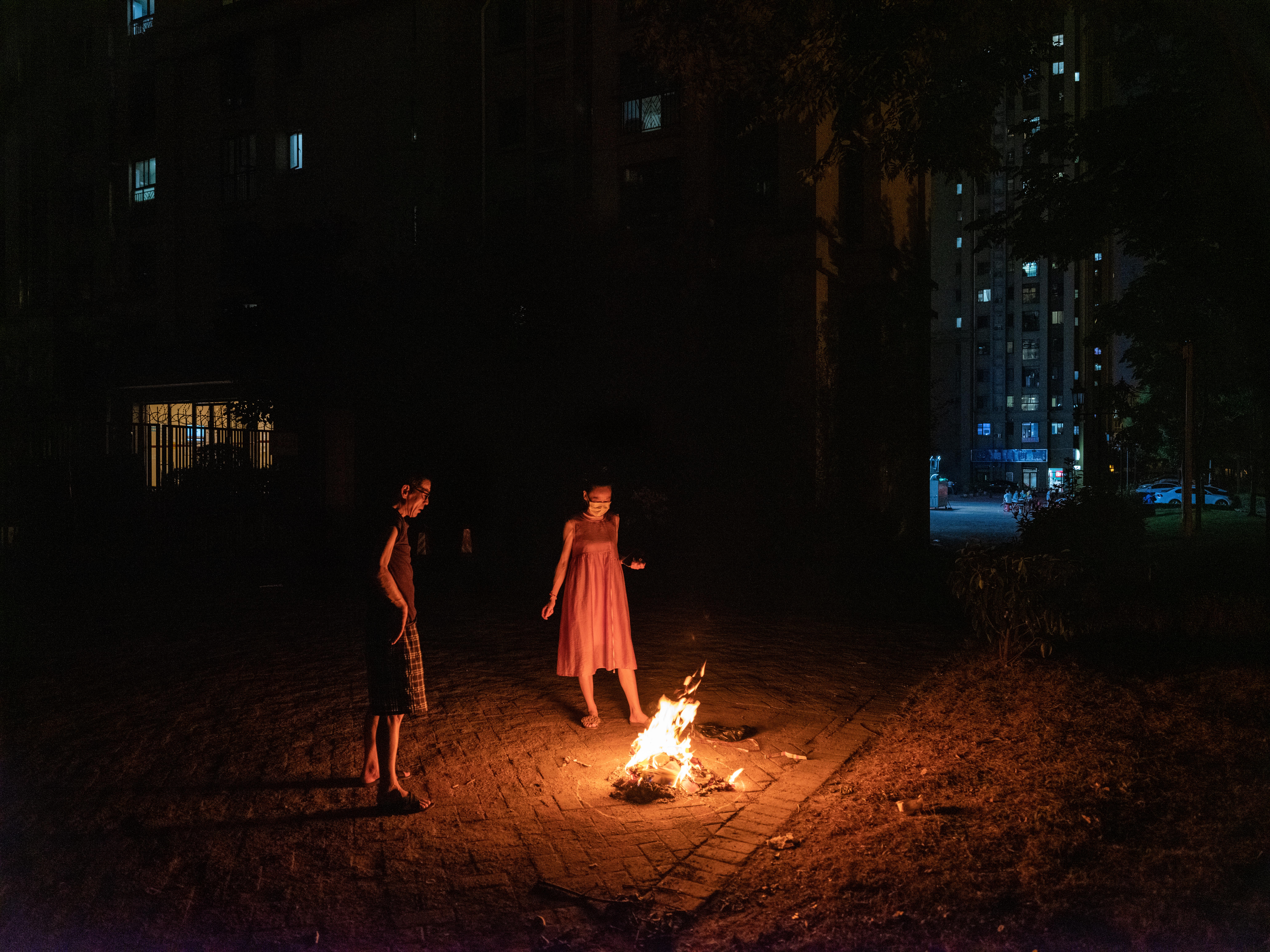 田老先生就住在吉庆社区,今年94岁,已经耳聋。农历七月十四晚七点半,他在地面上画了七个圆圈,每个圆圈都代表一个家属,“一个老伴的、一个父亲的、一个母亲的,其他的圈是烧给今年被新冠带走的和无家可归的野鬼,都不容易,给他们也烧一点。这个圈圈要留个缺口,他们才好拿钱。”年过六旬的儿子站在不远处陪着,因单腿残障,今年和老父亲度过了一个非常不易的春节,“我父亲有隐疾,那会儿也很不容易搞进医院做治疗,这个年岁在疫情期间活下来也不易,但他觉得自己占用了医疗资源。”