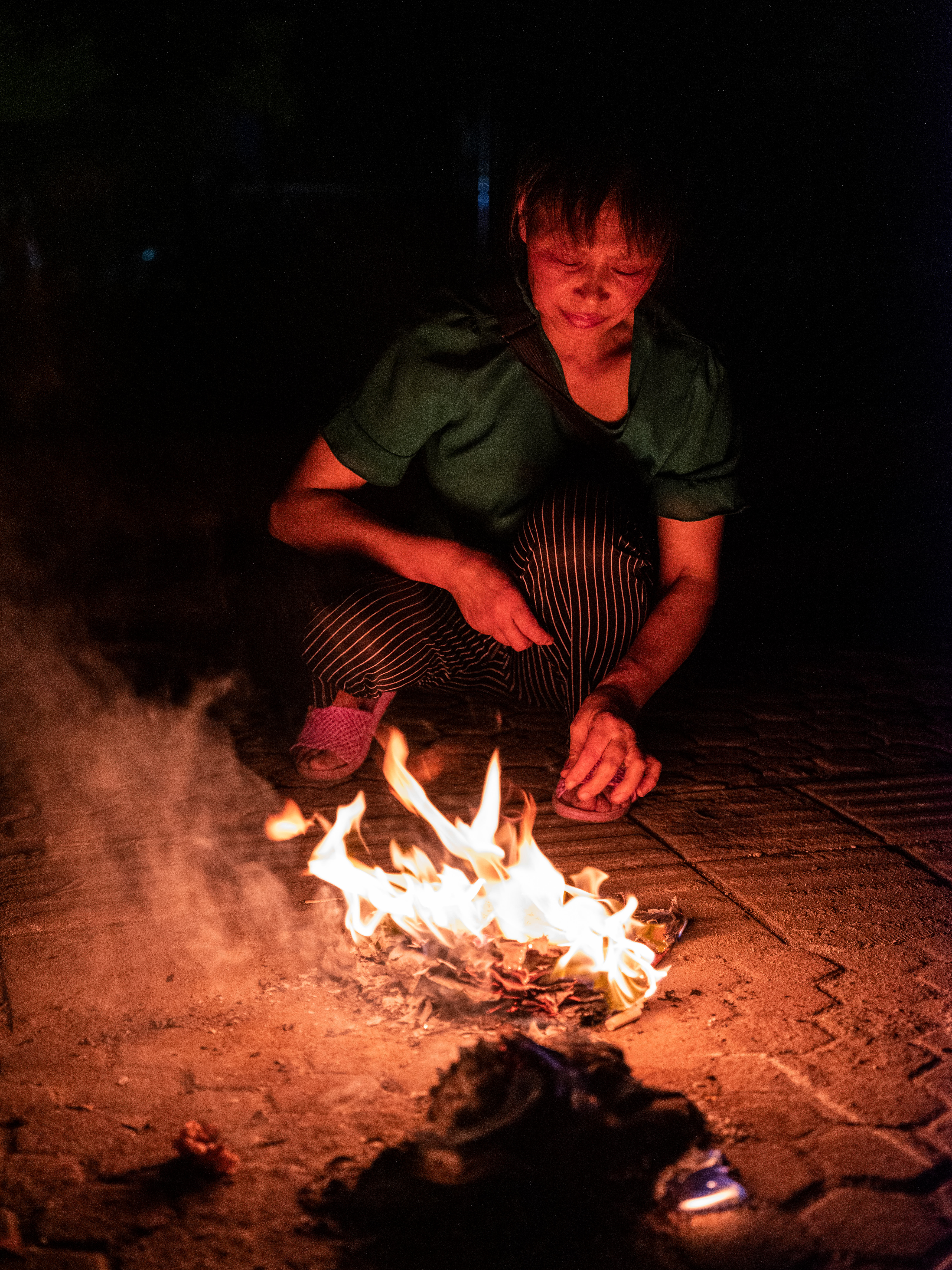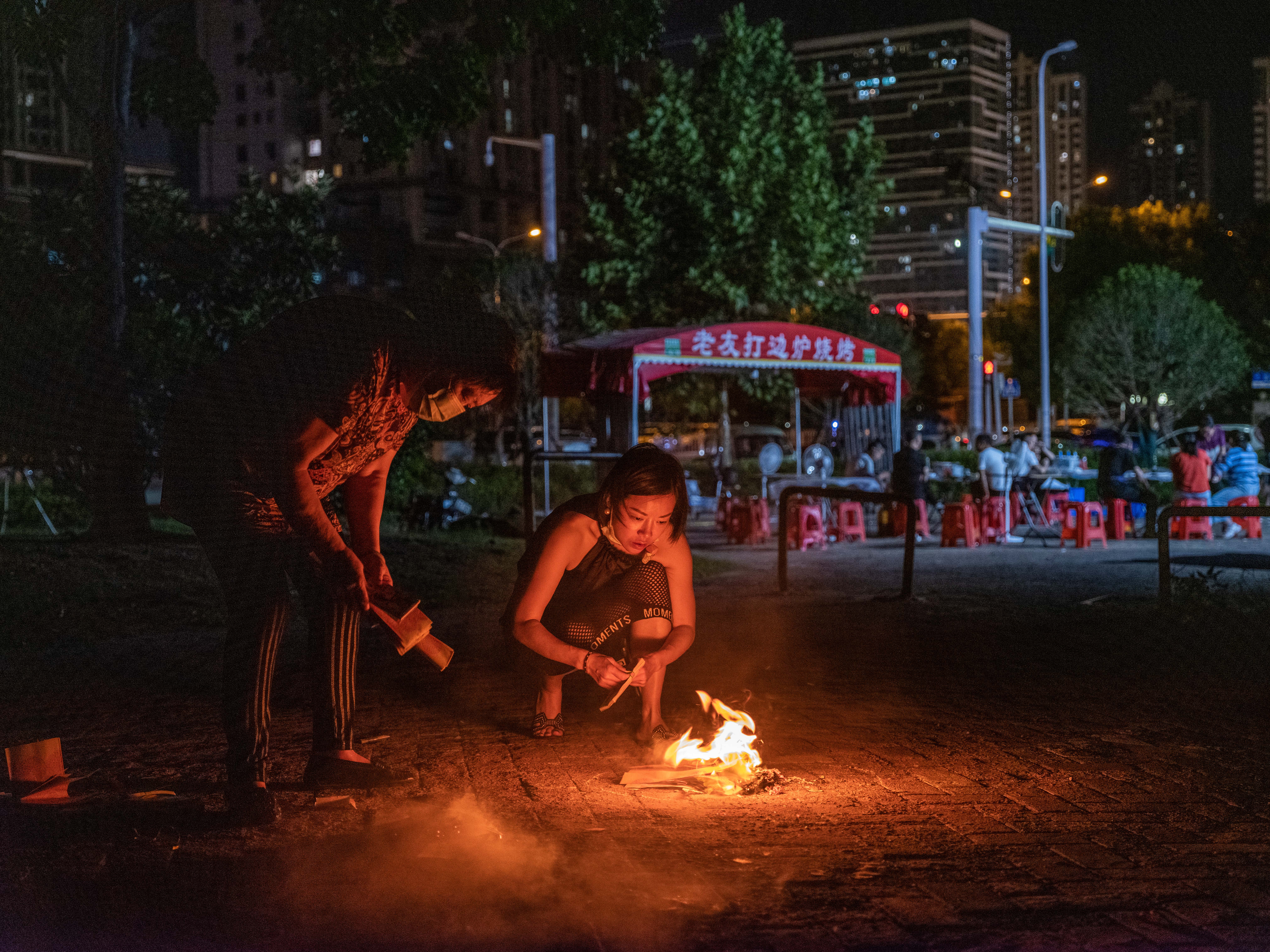 为了弥补清明节无法祭祀已逝亲属的遗憾,中元节前、当天的夜里,武汉居民们纷纷埋头在街头巷尾间焚烧冥纸,以慰亡者。按当地习俗,他们用白色粉笔在街面上划上一道道留有缺口的圆圈,有的还在圈里写上家属姓名,然后放入纸锭、金元宝、钱币等冥品。他们小声嗫嚅着,在念念有词的追思间伫立、默哀、作揖,最后待冥纸焚寂,归去。