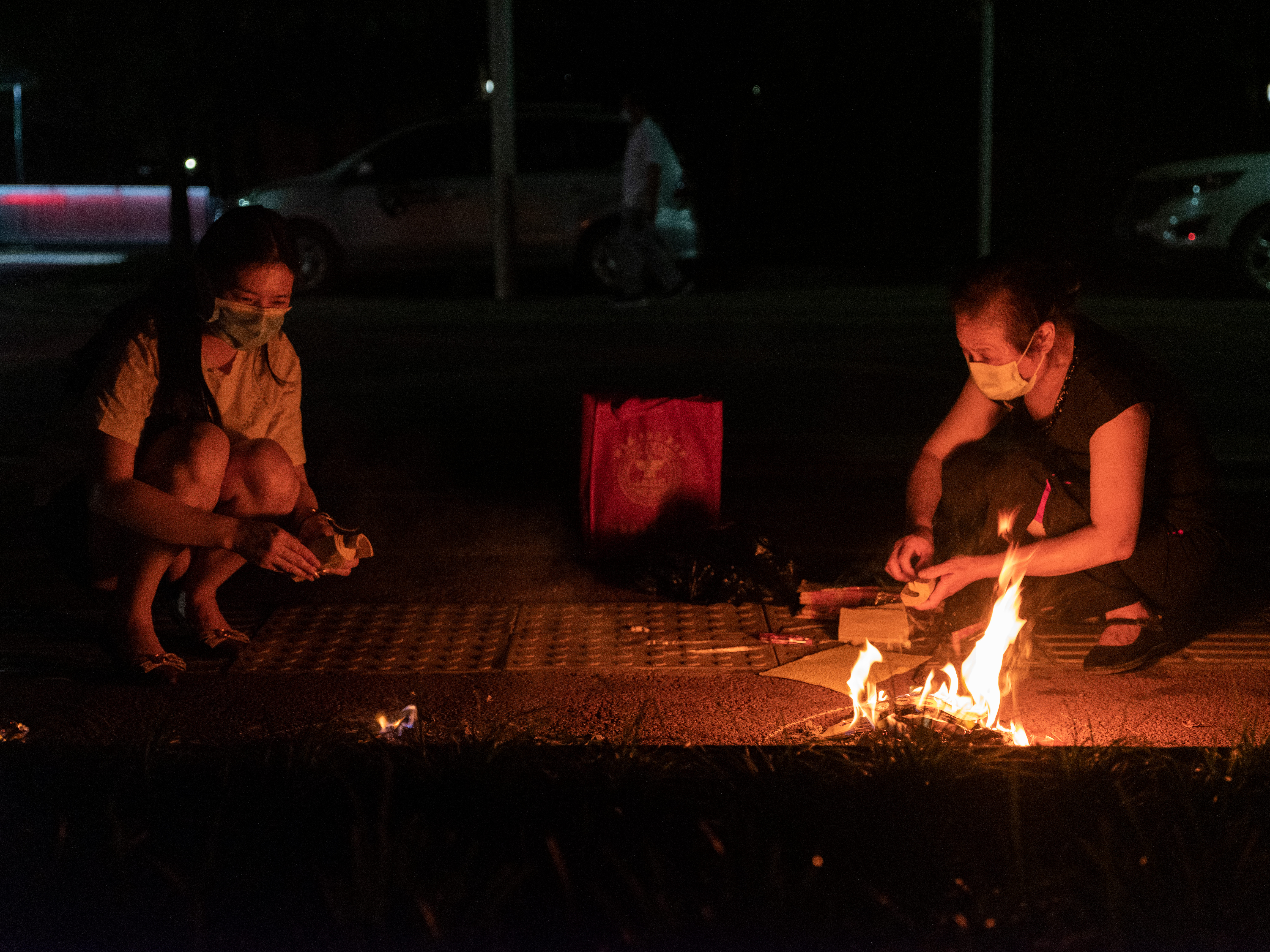 农历七月十五晚七点,在百步亭社区怡康苑小区居住十多年的一名市民,正在小区一角烧纸。“武汉封城以前,我们全家就去三亚度假了,图那边暖和过个冬。那时候还不知道这里会发生疫情。全家人待到4月份才回来,躲过了这次疫情,真是万幸。”