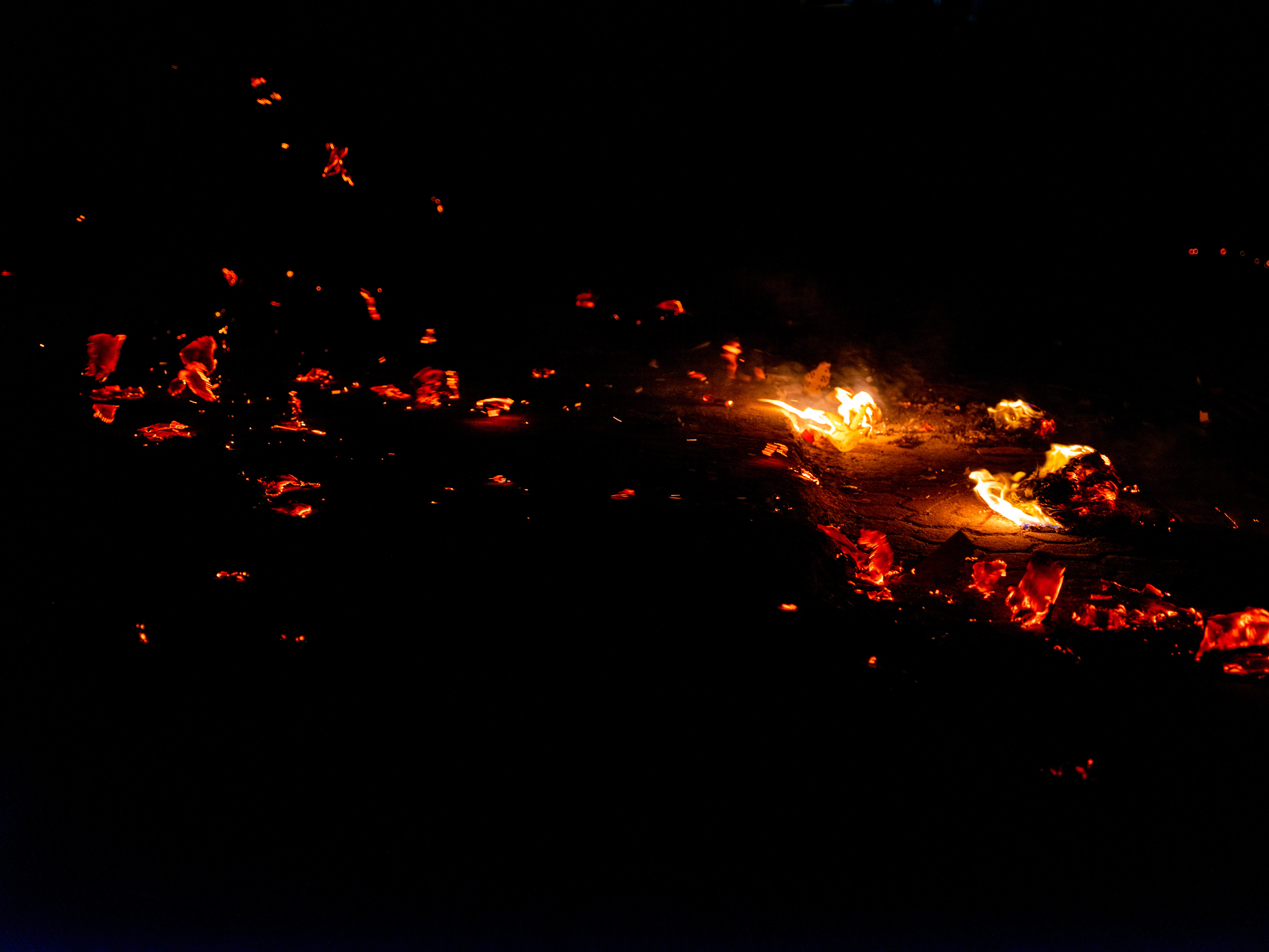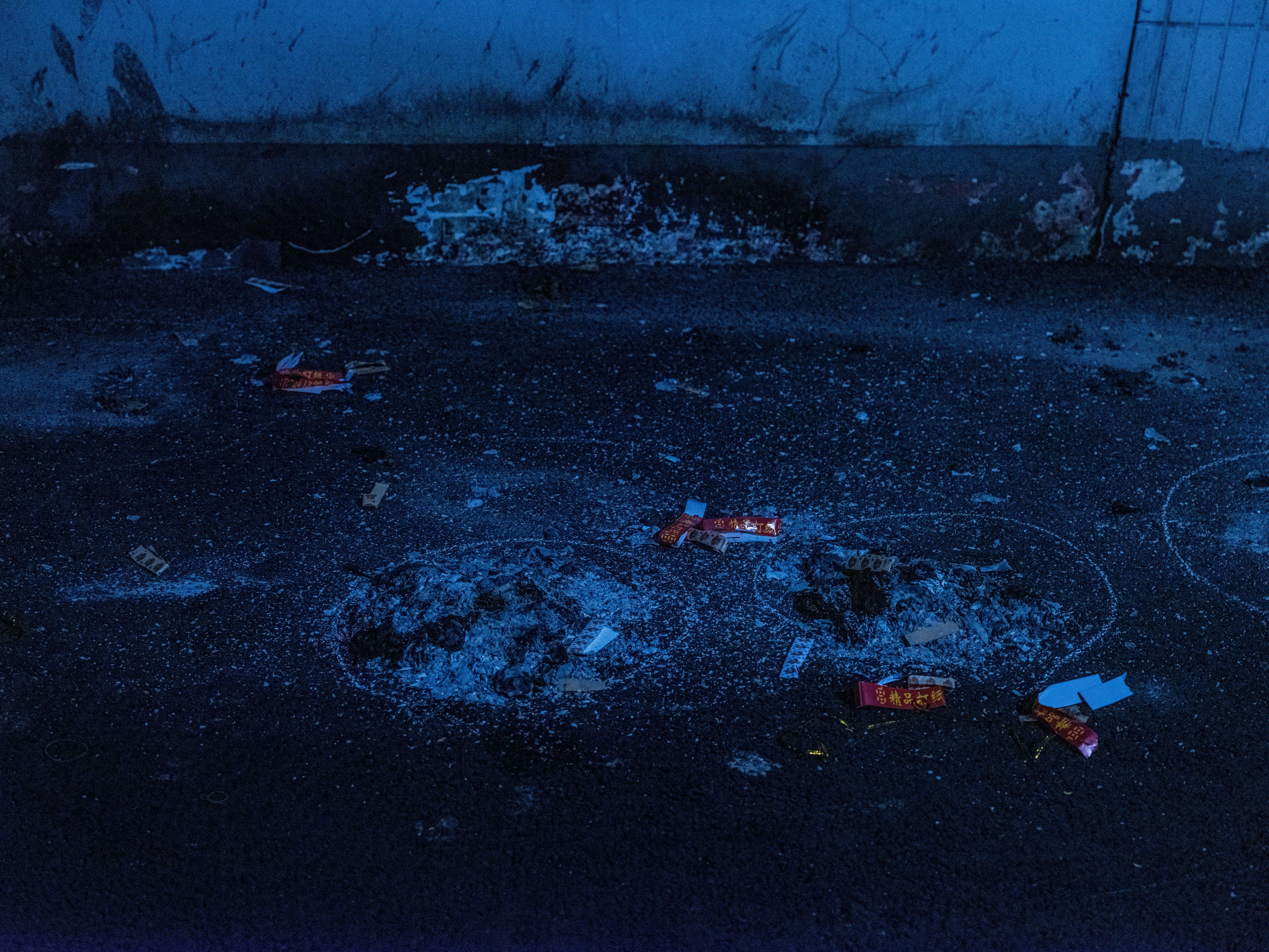 晚11点半,兴业路上焚寂的纸堆。凌晨过后,武汉的居民结束祭祀。第二天上班的环卫工将用烧碱清洗路面上的烧黑痕迹。
