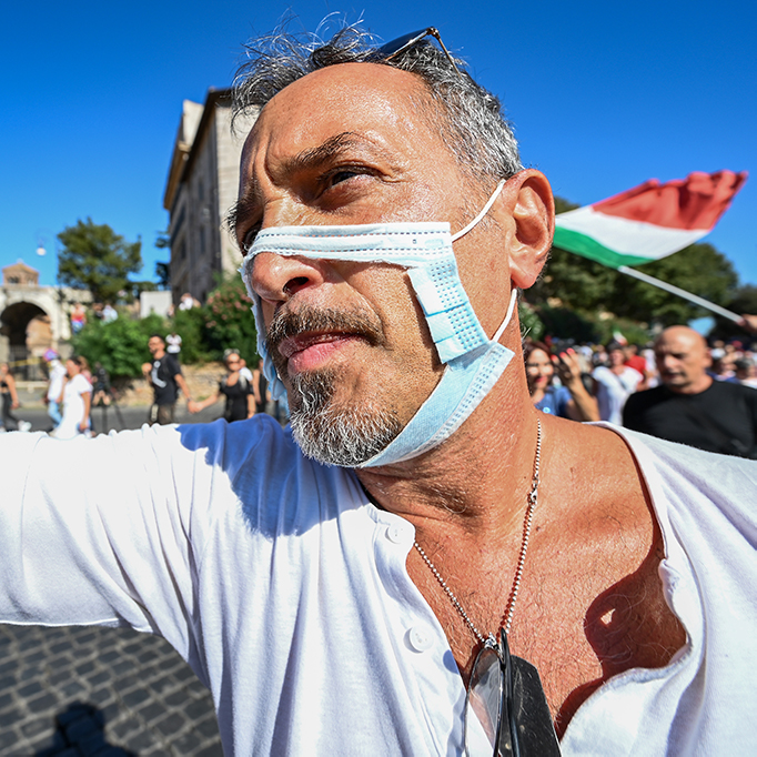 9月5日,在反口罩游行示威活动中,一名男子故意戴破损口罩,抗议防疫措施违反人权自由。当天,约有1500人走上街头,抗议包括强制学童戴口罩及接种疫苗在内的防疫措施,高举写着“拒绝口罩、拒绝社交距离”、“个人自由不容侵犯”以及“自由万岁”的横幅。意大利是最早受新冠疫情侵袭的欧洲国家之一,历经二月全国封城后,五月开始解封部分限制。据意大利紧急民防部的最新数据,确诊病例已达27.6万例,13个大区疫情呈恶化趋势,年轻确诊病例数量持续增长,疫情依然不容乐观。图片:Vincenzo PINTO / AFP