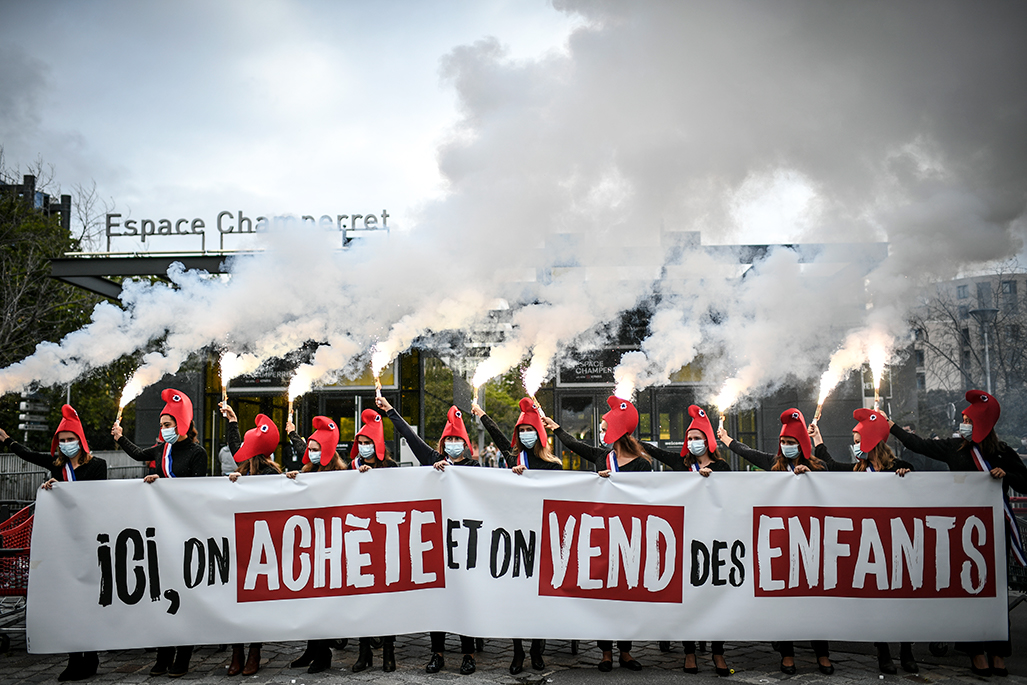 9月5日,反同性婚姻组织“为全民示威(La Manif pour Tous,LMPT)”成员手持写着“在这里我们买卖孩子”的横幅,抗议医学辅助生育措施(PMA)和代孕(GPA)。去年9月27日,法国下议院国民议会通过一项草案,允许所有女性(主要针对女同和单身女性)以人工方式进行受孕(La PMA)。该法案引发反同性婚姻组织强烈不满,宗教部门也坚决反对。反对者认为国家必须保障所有孩子的健康人格和人身权利,“他们应该拥有真实的父亲,而不是一个细胞样品”。图片:STEPHANE DE SAKUTIN / AFP