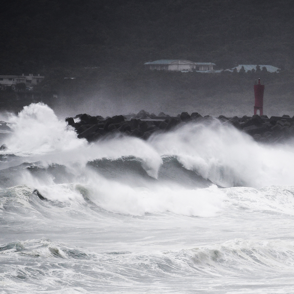 9月6日,超强台风“海神”逼近鹿儿岛县枕崎,海岸掀起巨浪。台风“海神”逼近日本九州岛南部地区,中心附近最大风速为45米/秒,造成九州地区至少13人受伤,约14万户停电,超20万人被迫撤离,包括丰田汽车公司和佳能公司等正计划关闭工厂。目前九州7县已对约184万人发出了避难指示。台风将保持强劲势力继续向九州北部逼近。图片:CHARLY TRIBALLEAU/视觉中国