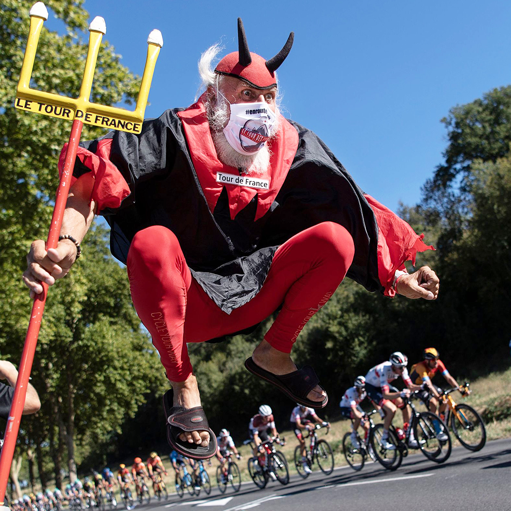 9月4日,在2020环法自行车赛的第七赛段比赛中,“恶魔迪迪”手持三叉戟亮相,自嗨搞怪为赛手们加油助威。现年68岁的迪迪·森弗特(Didi Senft)是一名狂热的德国自行车迷。自1993年以来,迪迪便身穿红色恶魔服装出没各类公路运动赛事中,并在赛道上留下标志性的三叉戟符号,成为包括环法自行车赛在内的各类公路运动赛事的一道靓丽风景线。图片:Marco BERTORELLO/视觉中国