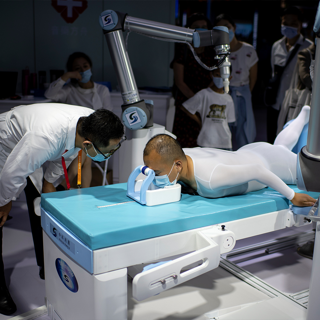 9月5日,在2020北京服贸会机器人主题展区,一台能够通过自动编程的人体针灸按摩机器人亮相现场,演示现场吸引了许多观众的关注。图片:NOEL CELIS / AFP