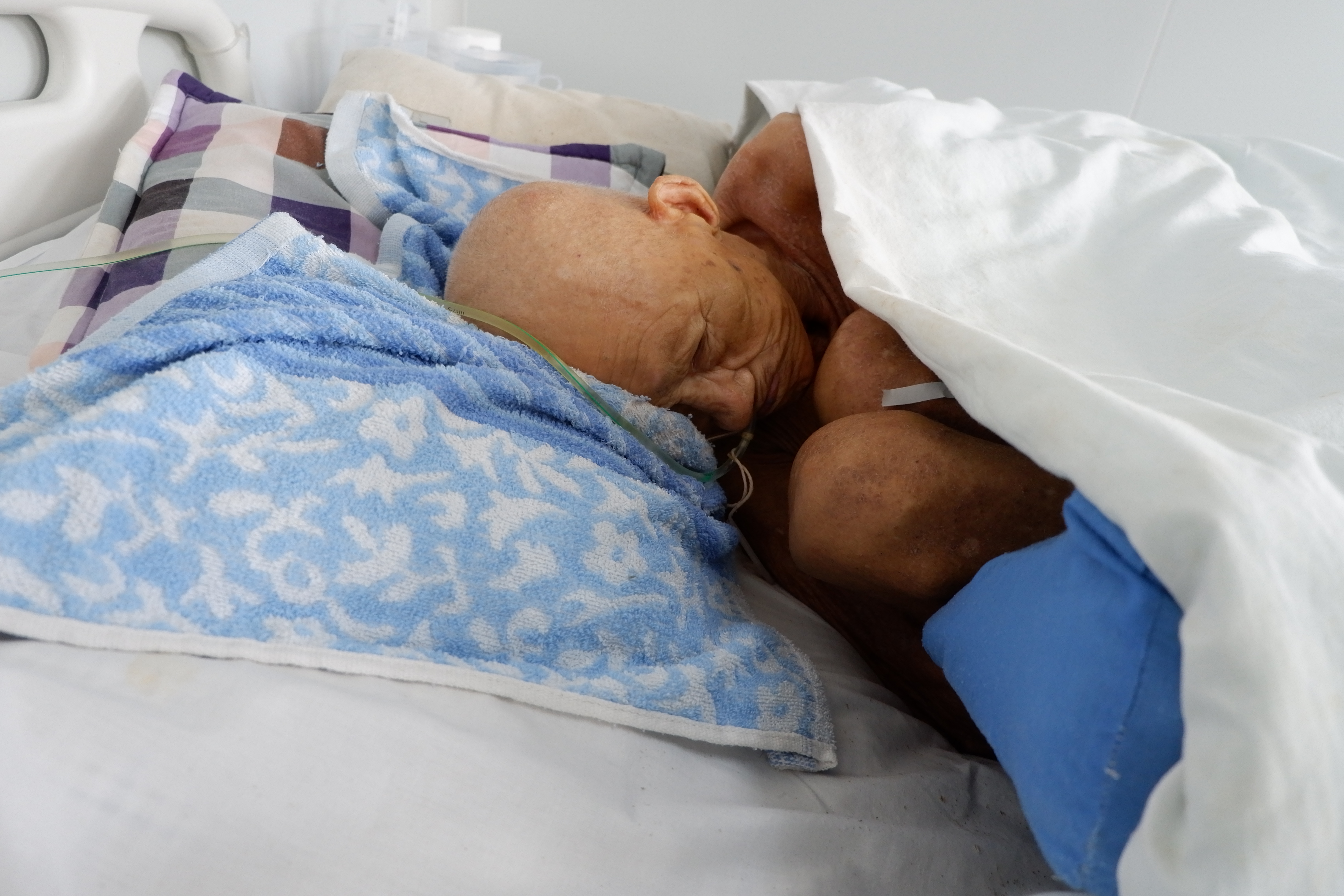 一位植物人老奶奶,长期环抱双腿,四肢难以舒展。 图片:顾月冰
