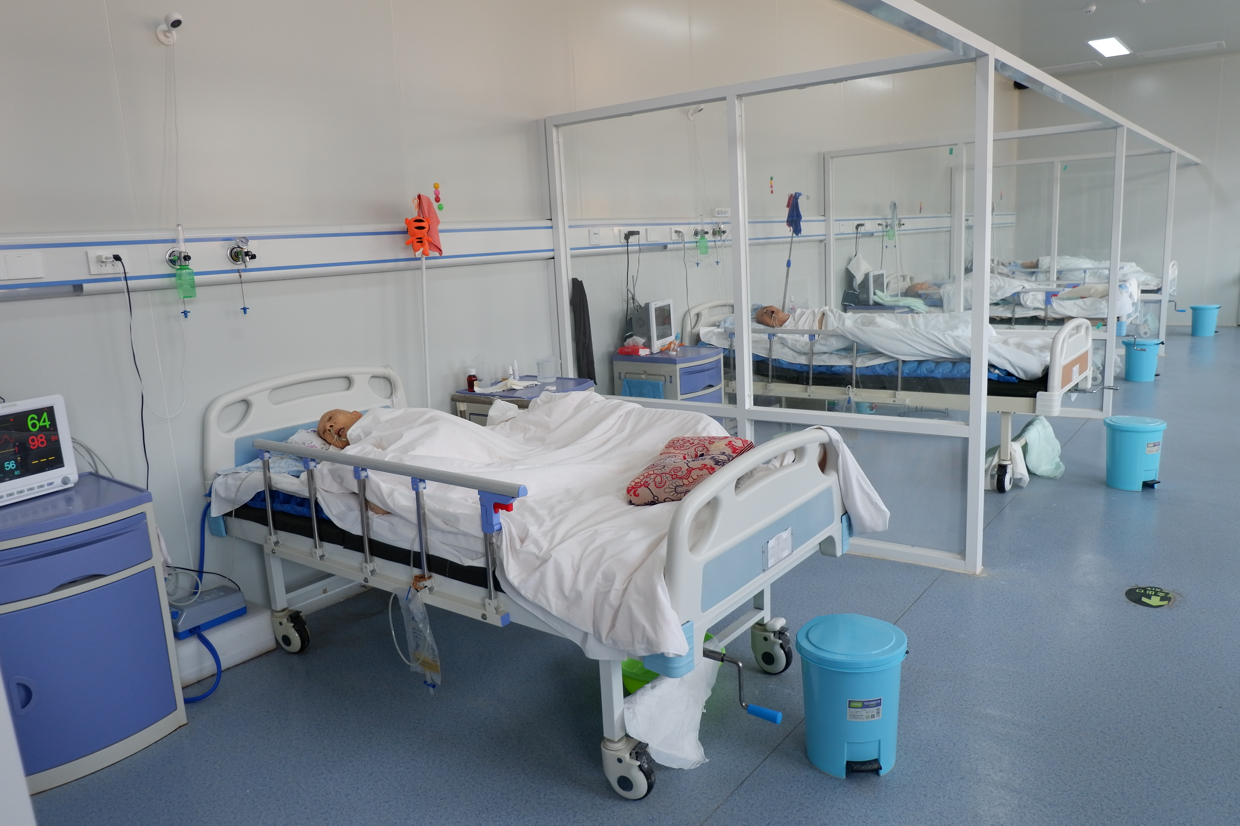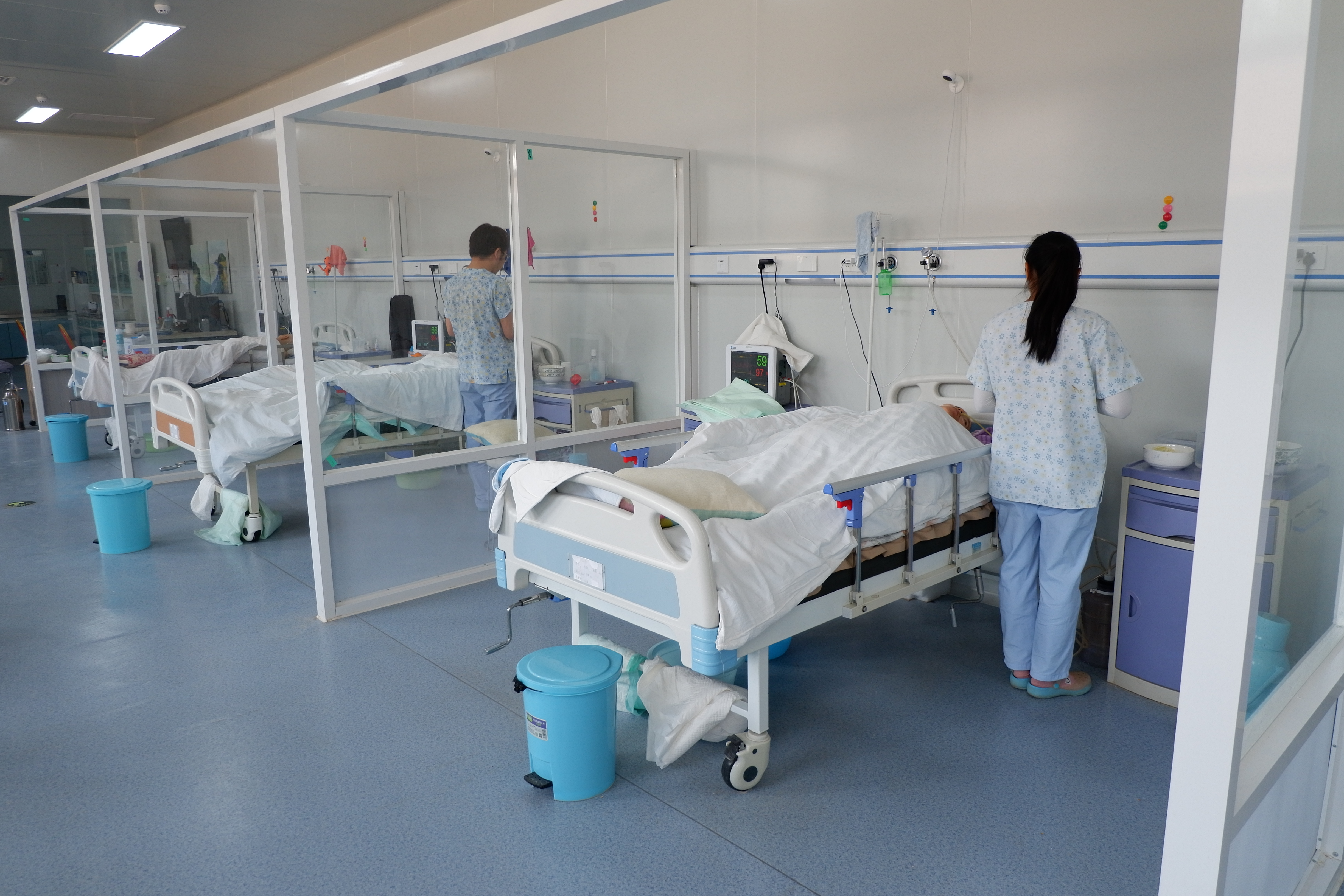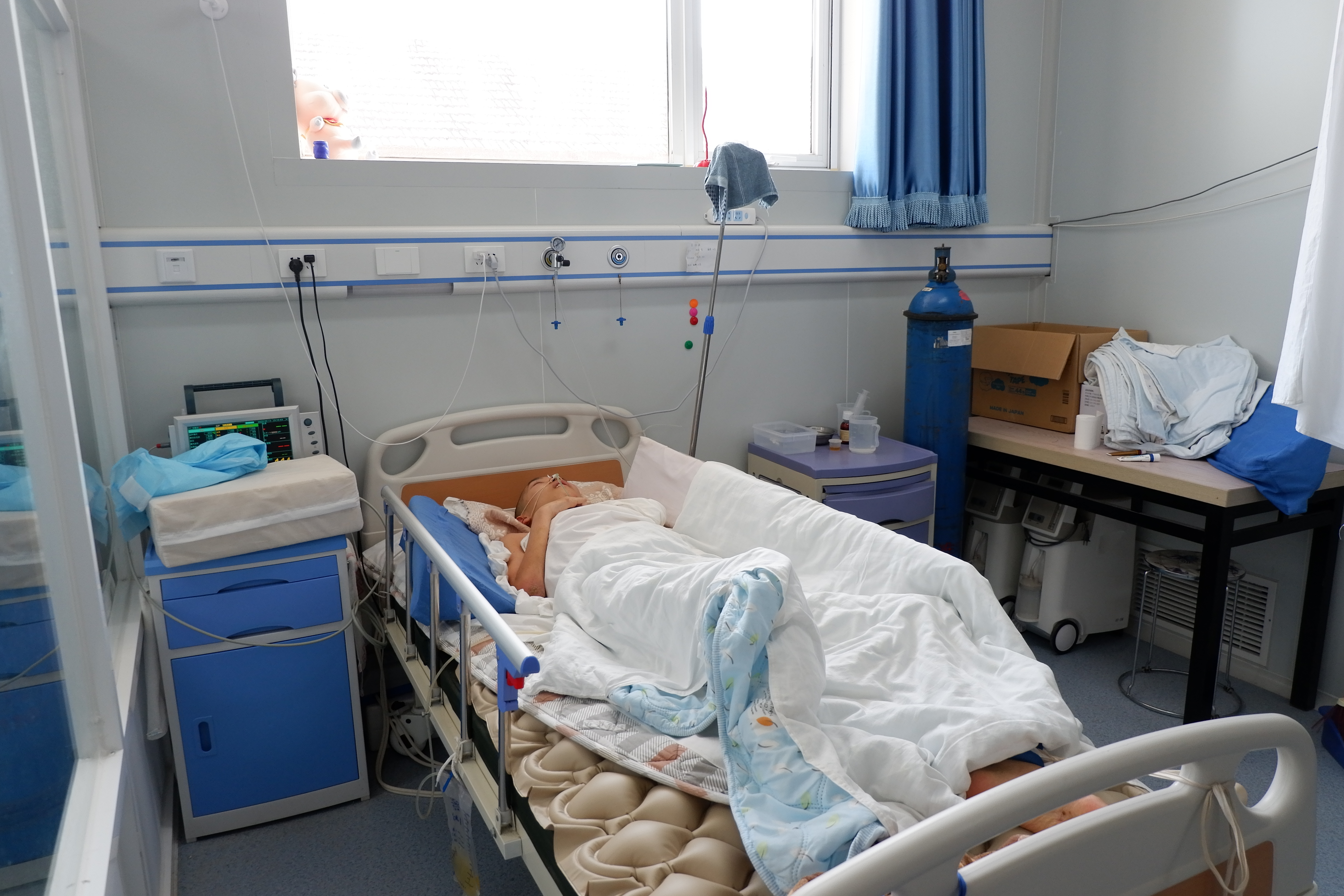 托养中心的病房和医院差别不大,每张病床上方有三样重症监护室的常备装置:血氧监测仪、负压吸痰装置、吸氧机。