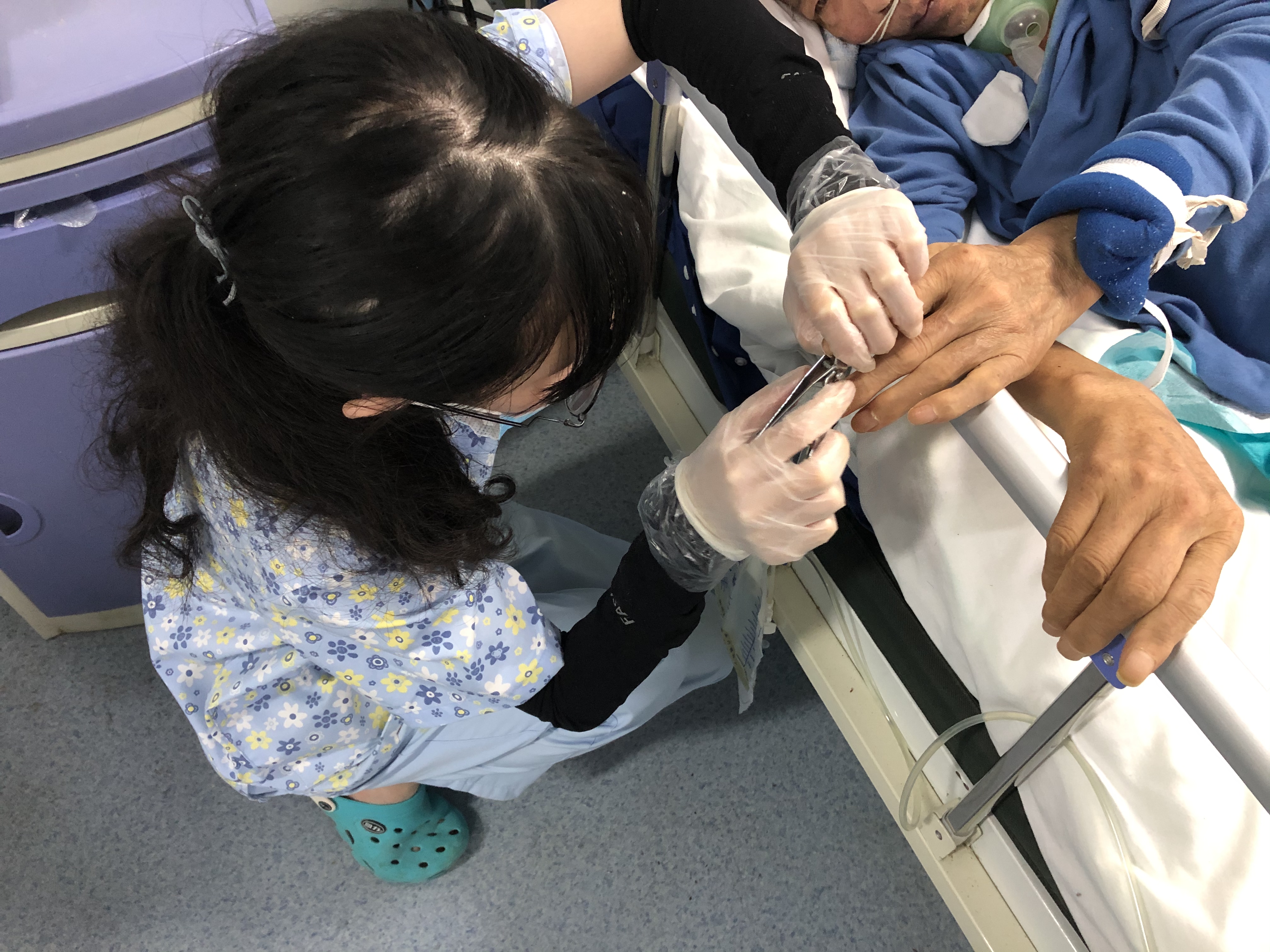 托养中心的护士正在给植物人患者剪指甲。 图片:郑立颖