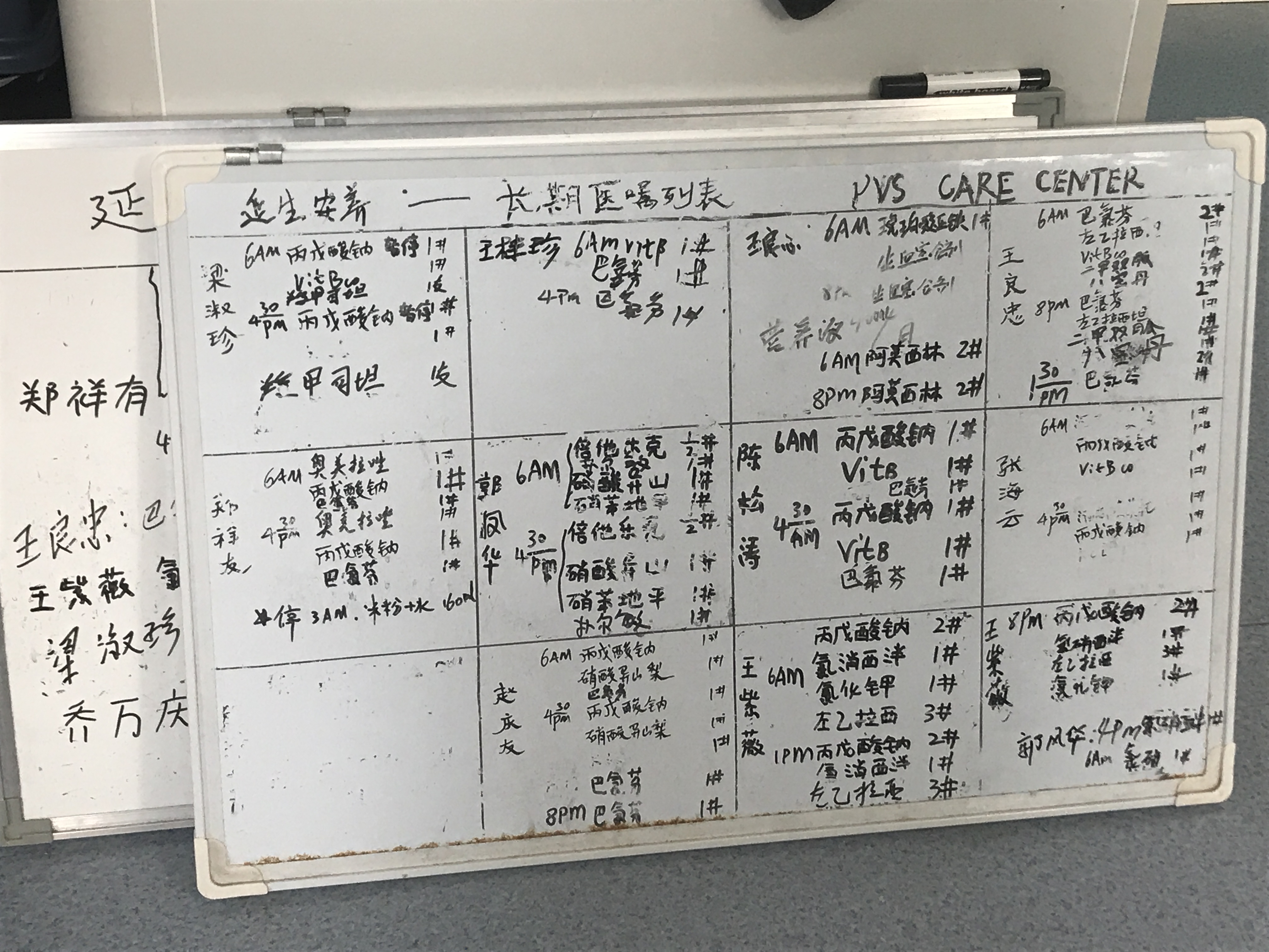 托养中心的白板上,写着病人的常用药。 图片:顾月冰