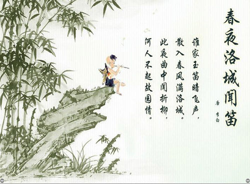 《春夜洛城闻笛》本是唐代诗人李白创作的一首诗。此诗抒发了诗人客居洛阳夜深人静之时被笛声引起的思乡之情,其前两句描写笛声随春风而传遍洛阳城,后两句写因闻笛而思乡。全诗扣紧一个“闻”字,抒写诗人自己闻笛的感受,合理运用想象和夸张,条理通畅,感情真挚,余韵无穷。