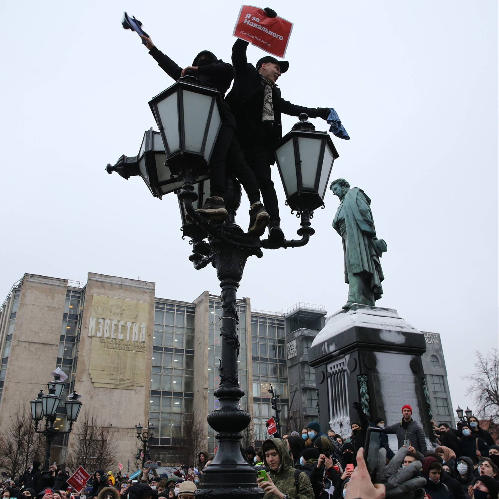 当地时间1月23日,俄罗斯莫斯科,游行集会者戴着口罩,手持“不要怕、不要沉默”等标语,高呼“自由”“一个人为大家,大家为一个人”等口号、从普希金广场出发,沿特维尔大街到达红场。游行集会期间,有人向警方投掷雪球、瓶子等物品。据俄内务部莫斯科总局消息,当天俄罗斯莫斯科,圣彼得堡和新西伯利亚等多个城市举行了游行集会,支持反对派人士纳瓦利内,人数在4000人左右。此前,俄内务部及总检察院发布消息称,23日各地的游行集会未经批准,是对公共安全的挑衅和威胁。同时,俄网络监管机构要求屏蔽网络上号召市民参与游行集会的信息。纳瓦利内是俄知名反对派人士,曾因欺诈和洗钱等罪名被判入狱,缓刑期至2020年12月底。17日返回俄罗斯的纳瓦利内在莫斯科谢列梅捷沃机场被拘留。图片:人民视觉