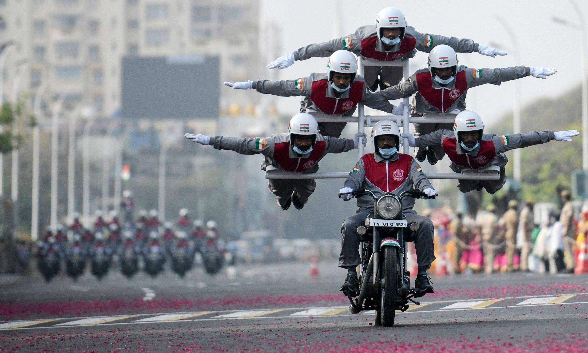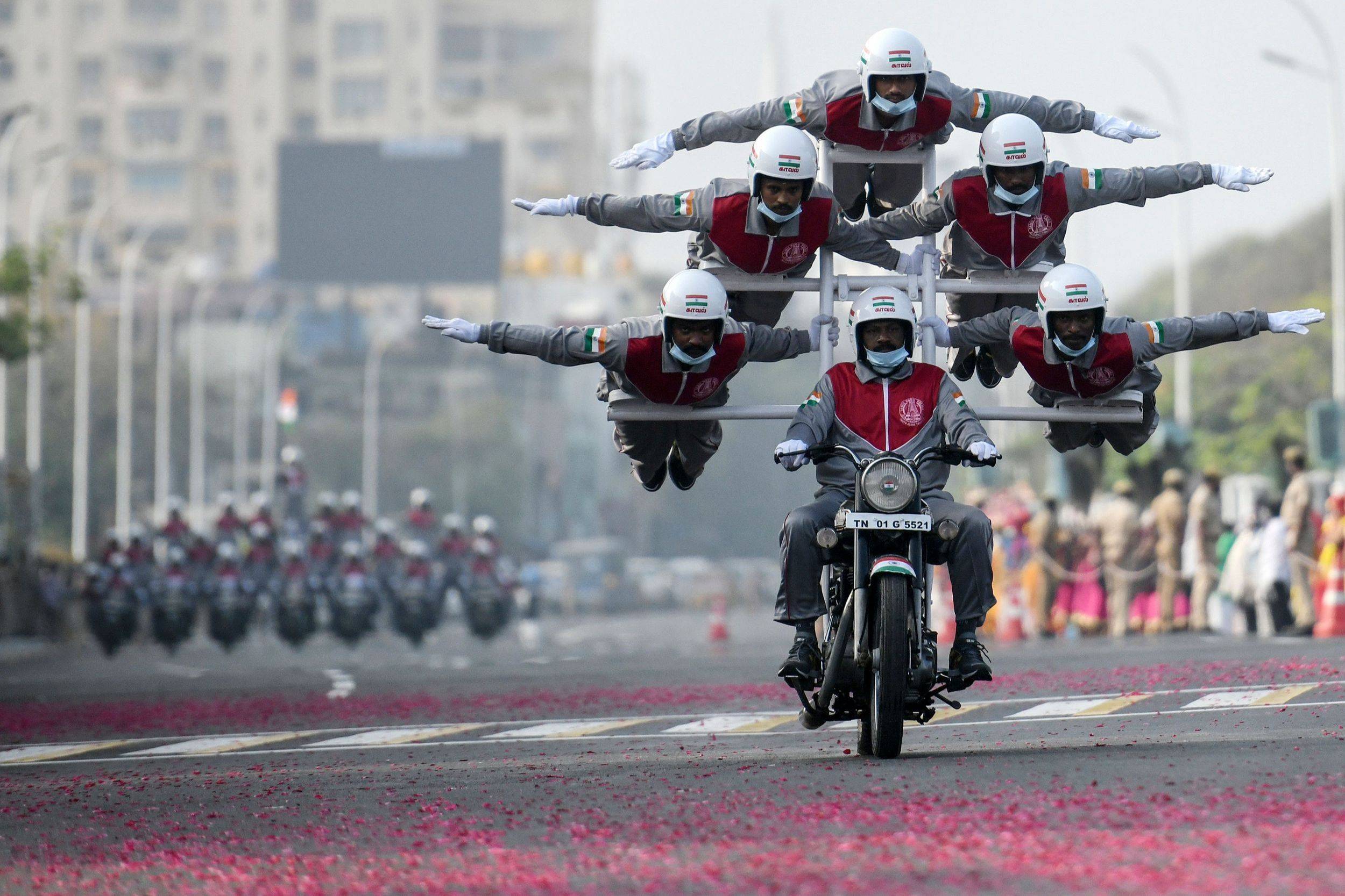 当地时间1月24日,为迎接共和国日阅兵,印度金奈举行彩排,摩托车杂技队正在进行表演。据了解,每年1月26日是印度共和国日(Republic Day),旨在庆祝印度宪法的诞生。自1950年起,印度每年在总统府和印度门之间的国家大道上举行阅兵和游行庆祝活动,主要包括阅兵和游行花车两部分,前者展示印度的军事实力,其中摩托车特技队表演是阅兵仪式的压轴节目。图片:人民视觉